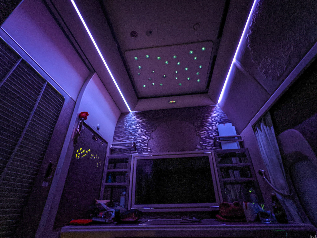 59. Лёг спать, выключил весь свет, который только мог - осталась лишь слабая подсветка на потолке. Это так-называемый mood-lighting. Оказывается, его не выключить. Может это требование безопасности? На самом деле он не такой яркий как на этой фотографии вышло - это просто ночной режим телефона.