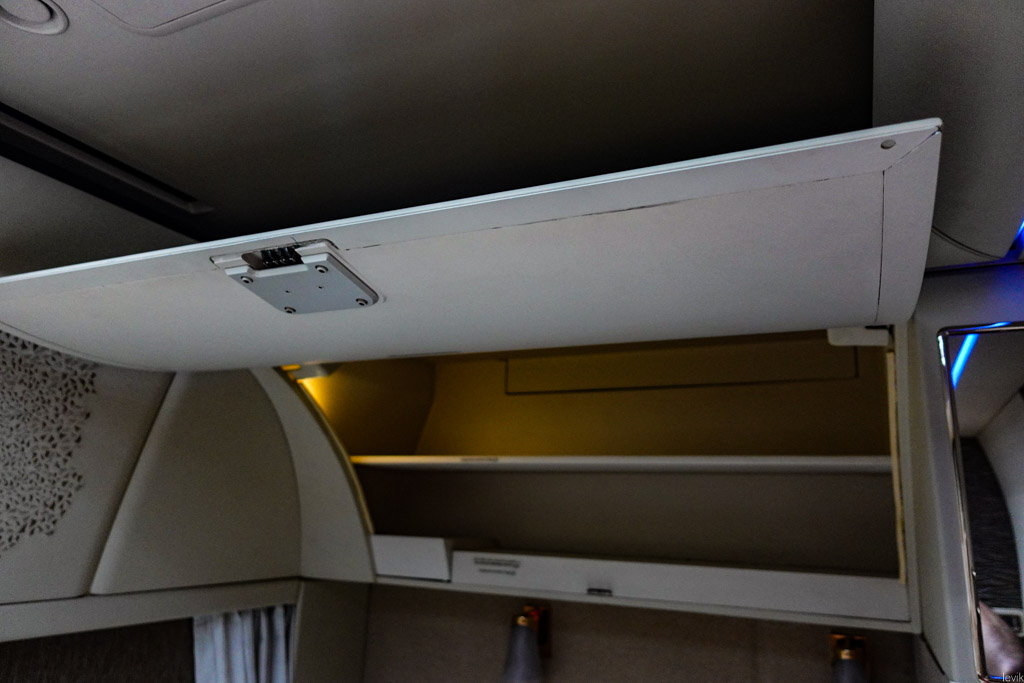 5. Как часто бывает в бизнес и первом классе, никто не рассчитывает что вы припрётесь сюда с крупной ручной кладью. В отличии от эконома, здесь нет багажных отсеков над головой. За креслом есть вот такая полочка, но на ней держат постельное бельё до тех пор, пока вы не попросите застелить вам кровать.