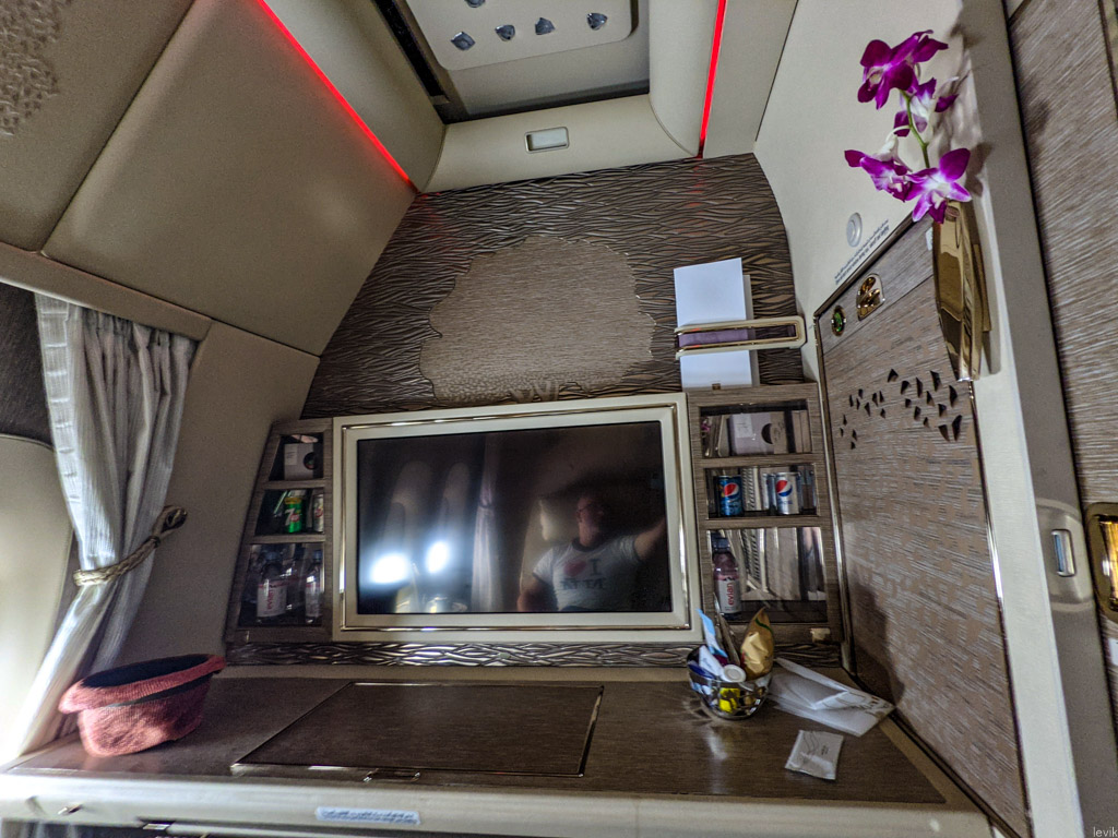 Напомню, что на многих других, даже самых элитных "каютах" двери и стенки поднимаются по плечо, или, максимум, в человеческий рост. Но тут двери и стены полностью изолируют пассажира от других, и от экипажа, что конечно очень круто, особенно в наше неспокойное время, когда зараза за каждым углом. Заслуживает ли это громкого названия "Game Changer" я не уверен.