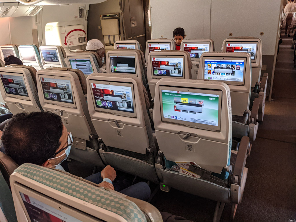 54. Несмотря на репутацию Emirates как щедрую авиалинию с просторными местами, тут в экономе тесновато - в каждом ряду по десять кресел - 3-4-3. Помню, когда я шесть лет назад впервые увидел такое на Boeing 777 у KLM, как я плевался - казалось, что пассажиров упаковали как шпроты в банке. А теперь это считается нормой в индустрии. Печально!