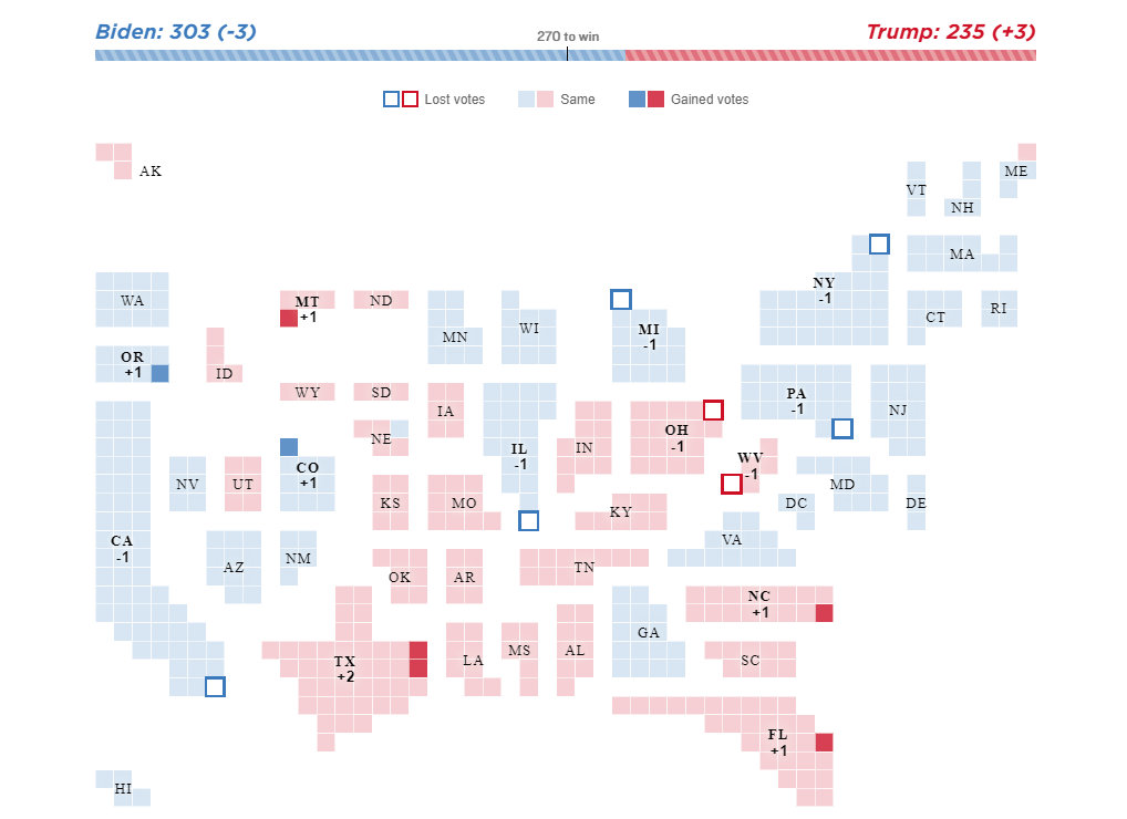 Напомню вам, что расклад голосов в Коллегии Выборщиков (которая фактически выбирает президента США) зависит от количества конгрессменов от каждого штата. Если бы прошедшие президентские выборы использовали новое распределение выборщиков, при сохранившемся голосовании штатов, Трамп набрал бы на три голоса больше (и всё равно проиграл бы Байдену).
