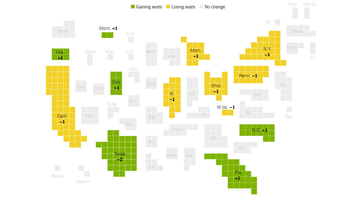 Вчера стало известно, что количество конгрессменов от штата Нью Йорк в очередной раз уменьшится в 2022 году. В прошлом году в США прошла перепись населения, на основании которой распределяют места в Конгрессе. Как случается каждые десять лет, в результате этого процесса есть штаты-лузеры (их семь), и штаты-победители (шесть - Техас получит сразу два новых мандата).