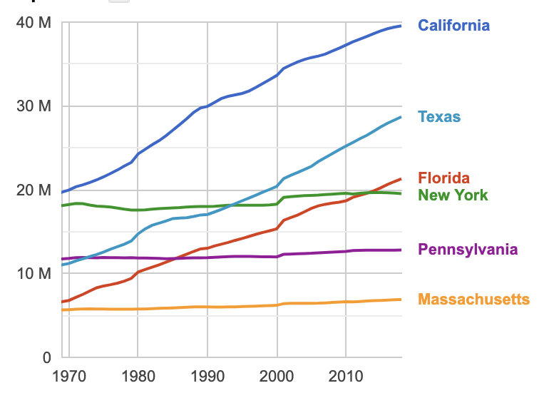 Давным-давно, во время Второй Мировой, Нью Йорк был первым в стране по населению. У нашего штата было 45 конгрессменов. С тех пор количество людей в штате выросло с 15 миллионов до 20, но это сильно отставало от скорости роста в других частях страны. Американцы всё больше двигали на запад. В середине 1960х Калифорния обскакала наш штат по населению, затем в 1990х это сделал Техас, а где-то пять лет назад Флорида отодвинула нас на четвёртое место.