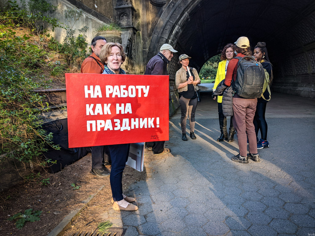 2. Я улетел из Москвы 1 января 1992, так и не побывав ни на одной первомайской демонстрации. И вот, почти 30 лет спустя в сердце капиталистического Нью Йорка, набрёл на сборище коммунистов по поводу Первого Мая. Они явно собрались для того, чтоб проявить солидарность трудящимся. Их было не очень много, зато они были весёлыми.