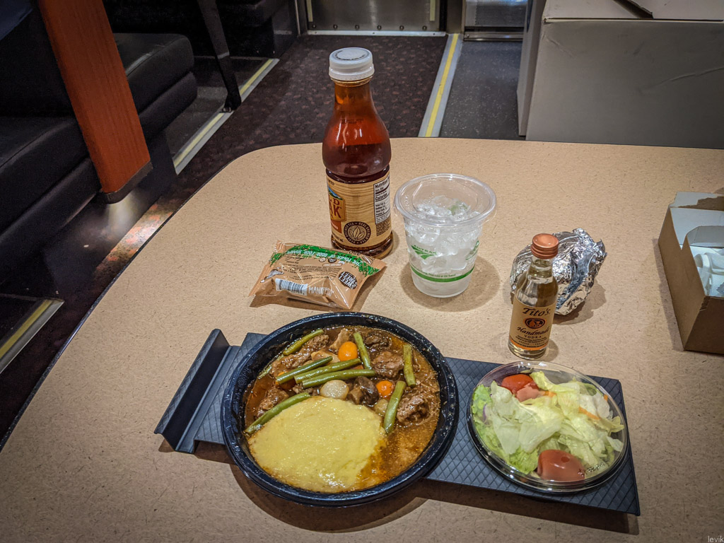 27. В цену билета входит питание. Что резонно: если ты едешь куда-то на протяжении 85 часов, должны же тебя чем-то кормить на поезде! Вообще то там работает полноценный вагон-ресторан, с нормальной посудой и блюдами. Но так как сейчас у нас ковид, во время нашей поездки вся еда была запечатана в одноразовую упаковку, которую явно просто на месте разогрели. Можно вообще попросить, чтоб тебе всё принесли в номер и есть там, но у нас было слишком много вещей, чтоб как-то удобно можно было расположиться возле стола, так что невзирая на коронавирусную опасность мы пошли всё же в вагон ресторан.