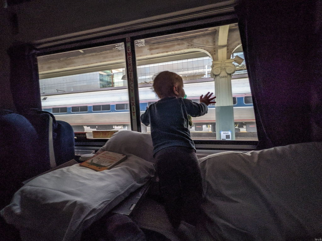 32. Особенно здорово было наблюдать за тем, как Айя смотрит в окно на пробегающие мимо пейзажи. (Хотя пейзажи были не самыми красивыми - для этого надо ехать на запад.) Это был для неё первый в жизни поезд (хотя она уже несколько раз бывала на нашем нью-йоркском метро), и она с любопытством изучала все купейные штучки, и вообще оказалась очень любознательной в новой среде.