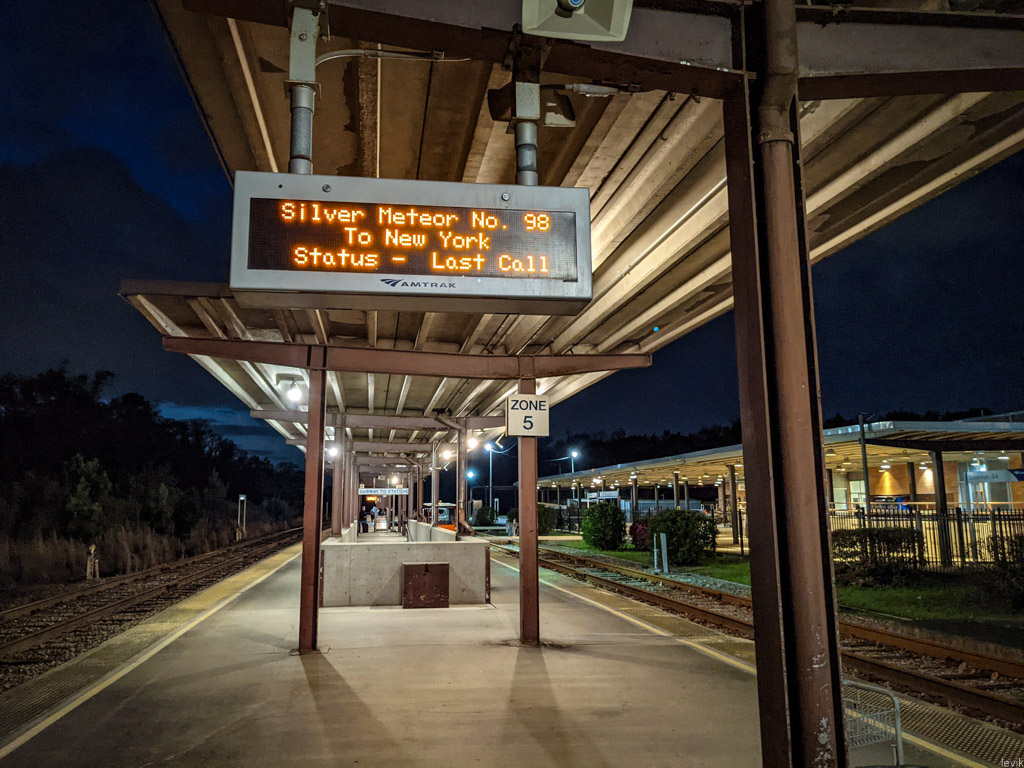 9. Наш поезд задерживается. О получасовой задержке предупредили ещё днём по СМС, но оказывается, что он будет ещё минут на 45 позже. Это происходит частично из-за того, что частные железные дороги иногда отдают на своих путях приоритет своим же грузовым составам. Но в общем все пассажиры привыкли к такому. Как я сказал, многие энтузиасты воспринимают такие поезда дальнего следования скорее как круизы, чем средство передвижения. Подумаешь, если твой круиз задержался на часик... Ничего страшного. Короче, мы со своим багажом размером с небольшой цыганский табор заняли одну из скамеек.