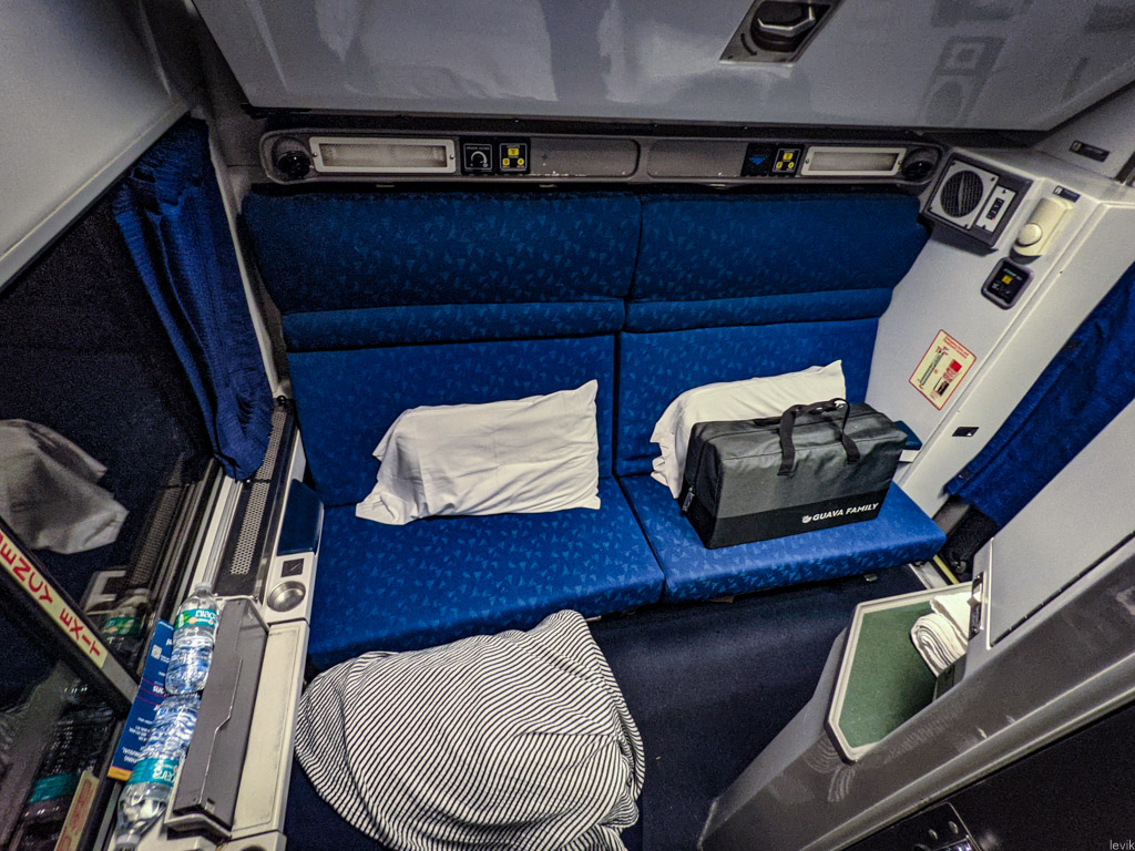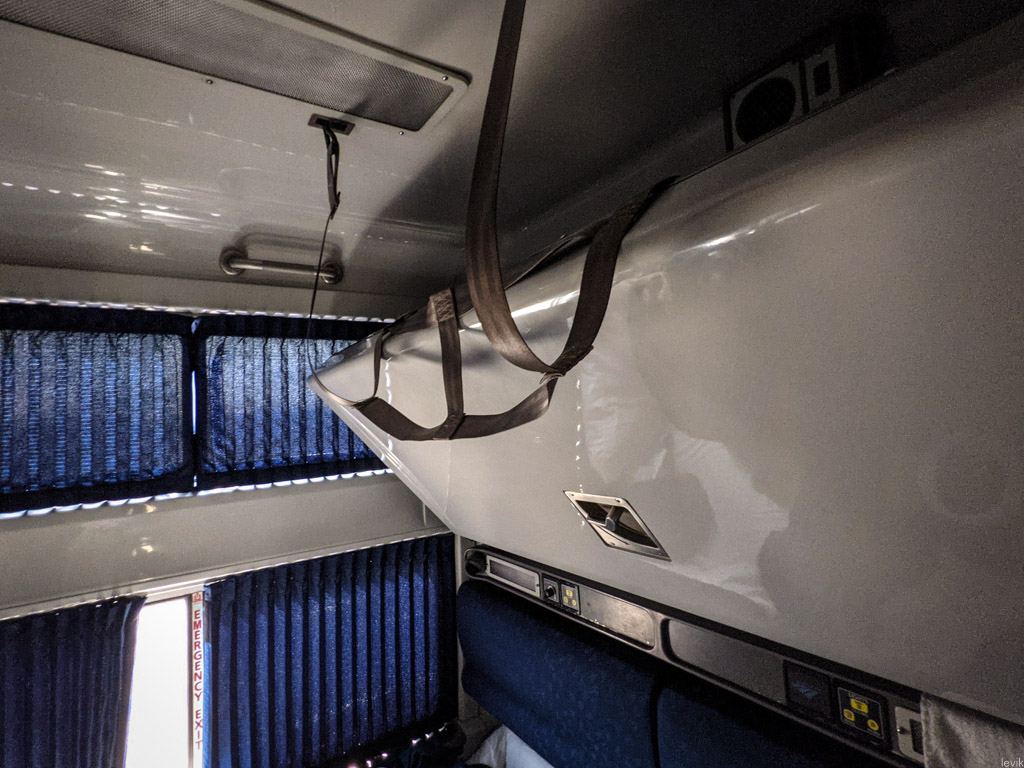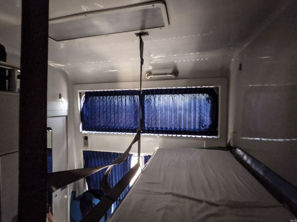 20. Если её разложить, становтся очевидно, что она уже нижней, и примерно сопоставима по ширине с российскими полками в купе или плацкарте. Зато у пассажира верхней полки есть своя створка окна с отдельной занавеской, а ещё тут довольно высокий потолок, так что можно даже без проблем сидеть, выпрямившись.