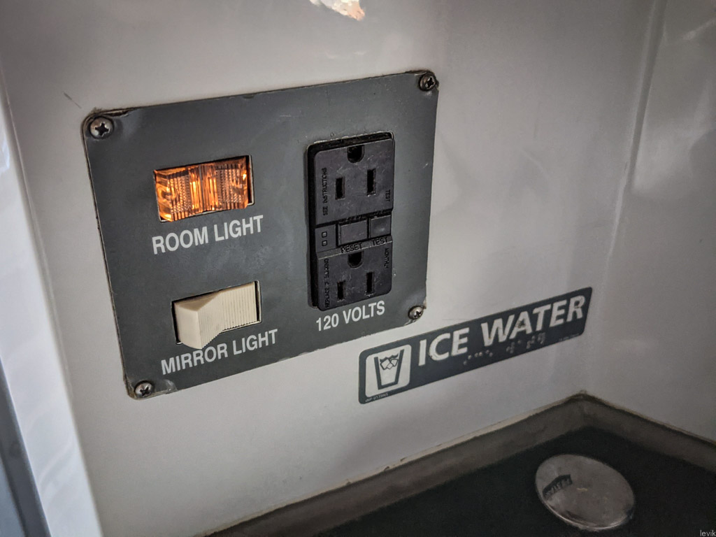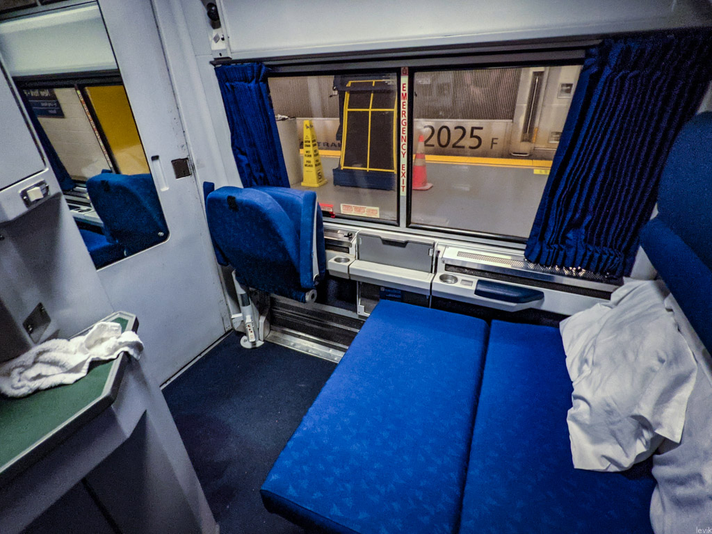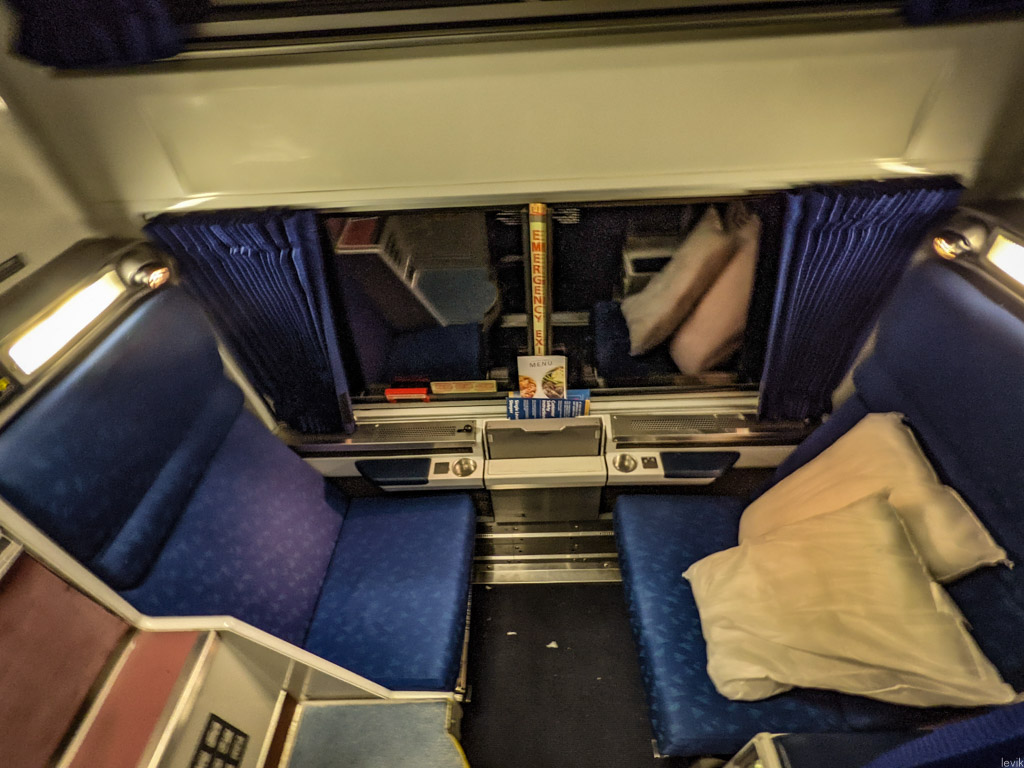 Но почему-то я даже не подумал, что на поезде может быть что-то подобное. А зря! Нынешние спальные вагоны в массе своей были построены лет 20-30 назад. Все они видали виды. Но, оказывается, несколько лет назад, Amtrak заказал и ввёл в эксплуатацию несколько вагонов Viewliner второго поколения. Их можно легко отличить тем, что там вся обивка лиловая а не синяя. Кроме того, там всё чище и новей, больше розеток, и вообще приятней атмосфера.