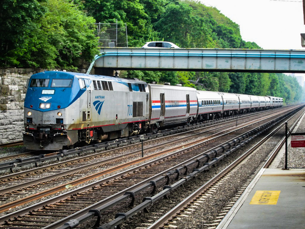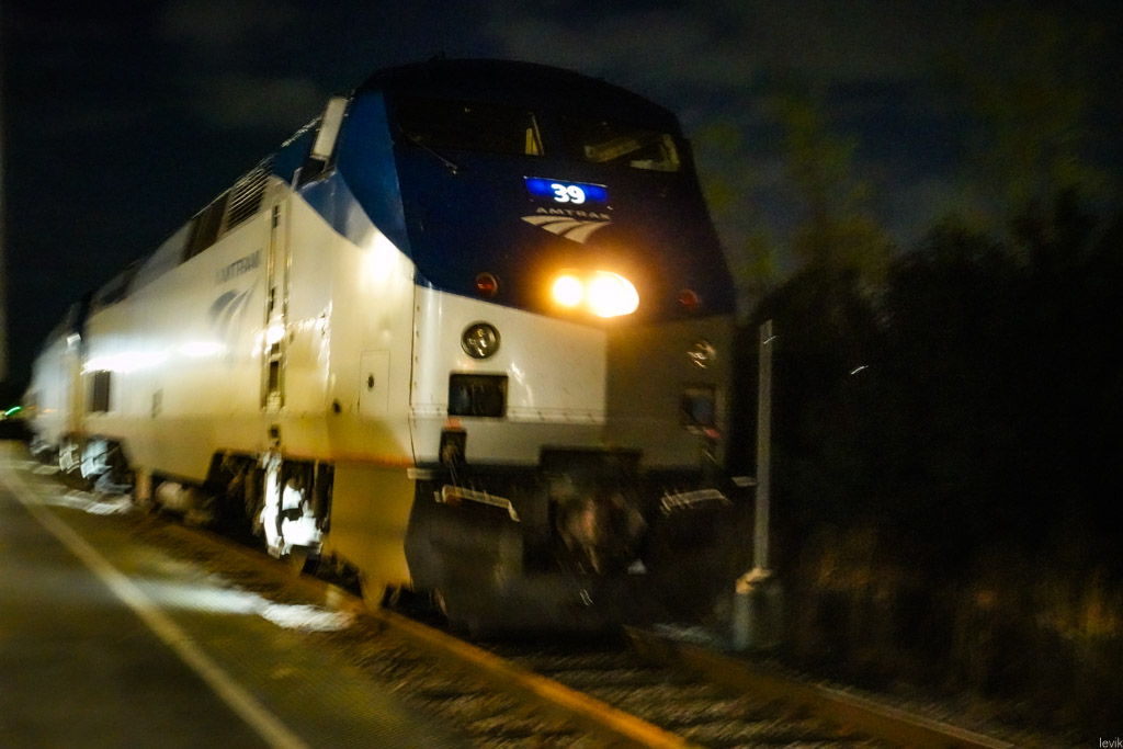 11. Но вот, наконец он идёт. Огромная махина локомотива прогремела по рельсам, а за ней и целый хвост хромированных вагонов. Amtrak свои вагоны толком не красит, просто рисует на них фирменную красно-бело-синюю полоску.
