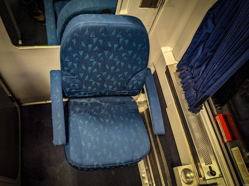 23. Прежде чем на нём можно сидеть, его надо развернуть на 90 градусов, и откинуть. В нём один пассажир может сидеть напротив другого, который развалился на гораздо более удобном диванчике с другой стороны стола.