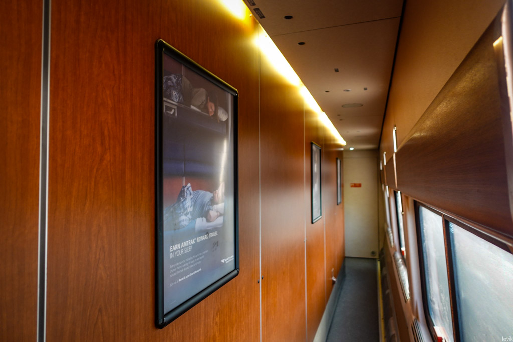 12. Так как мы восточней Чикаго, спальные вагоны в нашем поезде - одноэтажные Viewliner. Я, если честно их не посчитал, но мне показалось, что в составе их было штуки три. В каждом таком вагоне большая часть места отдана под крохотные "комнатушки" - их 12 штук, и они вмещают до двух пассажиров.