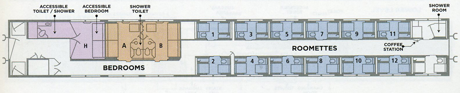 Но с одной стороны есть три "спальни" - эквивалент привычного многим из нас купе. Одна из них попросторней других, она рассчитана на маломобильных пассажиров. Говорят, такое нельзя забронировать через интернет, надо звонить в Amtrak, где могут потребовать доказательство маломобильности. Зато две другие комнатки можно при желании соединить в одно супер-купе (разумеется, это будет вдвое дороже).