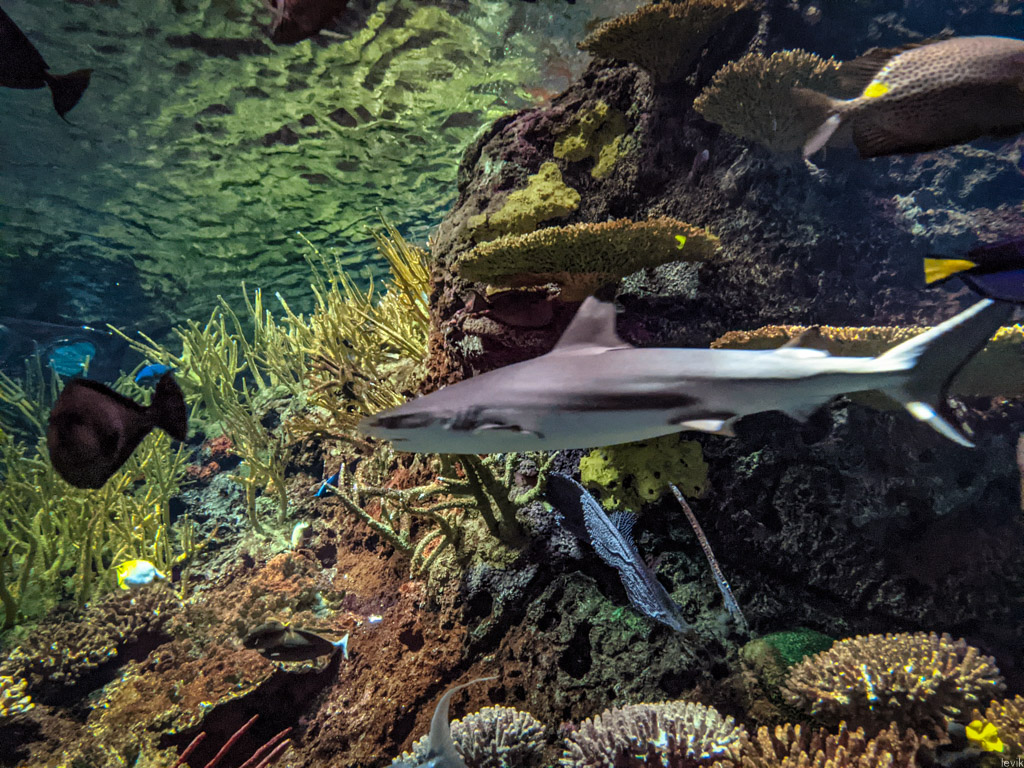 9. Больше всего тут гордятся своими акулами, хотя их труднее всего фотографировать. Собираясь впопыхах, я забыл взять с собой фотоаппарат, и снимал всё на свой телефон, которого к сожалению не хватало на то, чтоб снимать в сумерках быстро плавающих рыбёшек. Так что, заранее извиняюсь за качество.