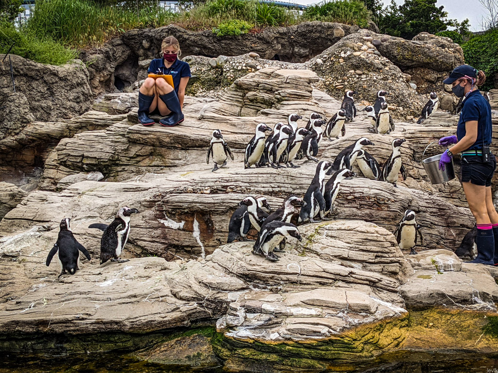 6. Подошли ближе, оказалось, что там пингвинов кормят. Все очень любят пингвинов, про них много детских фильмов снято и книжек написано. Мы с Тоней, после поездки в Антарктиду, немного охладели к этим птицам - в натуральных условиях пингвины оказались совсем не такими, какими их рисует поп-культура. Но так как для Айи всё это было в новинку, мы решили потерпеть, и посмотрели как эти несуразные птички важно шатаются с бока на бок в ожидании рыбы.