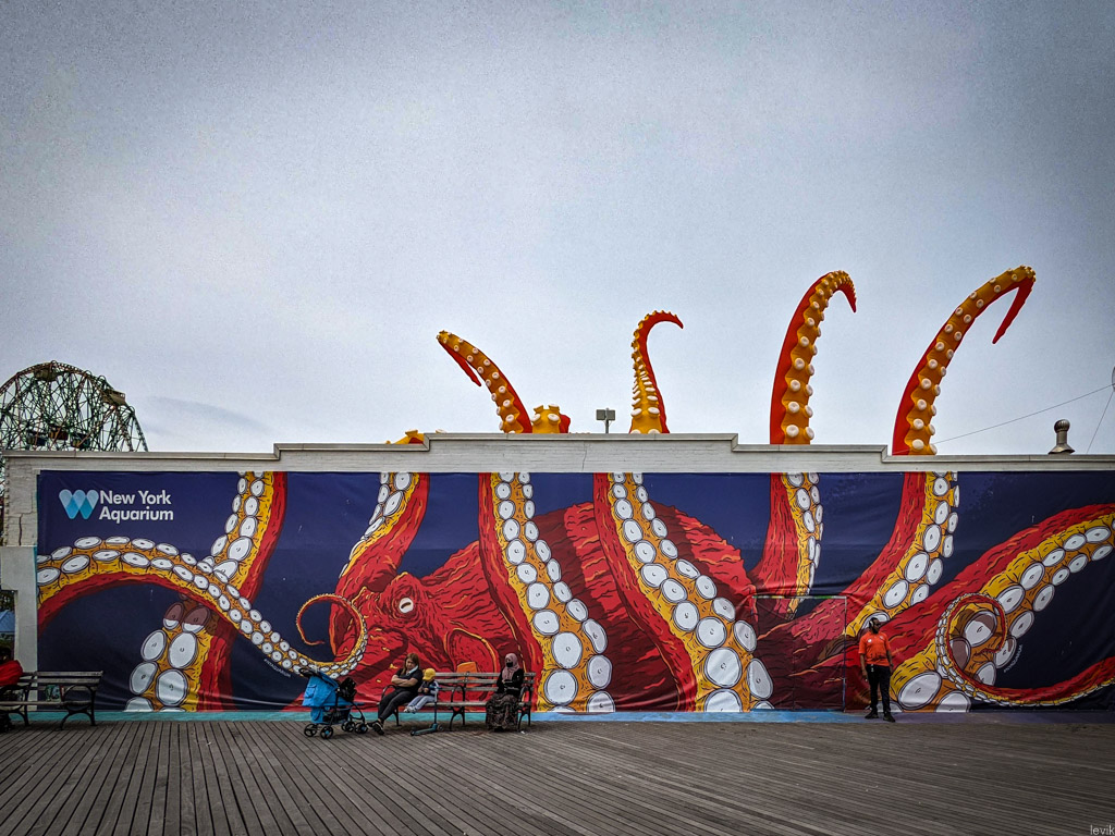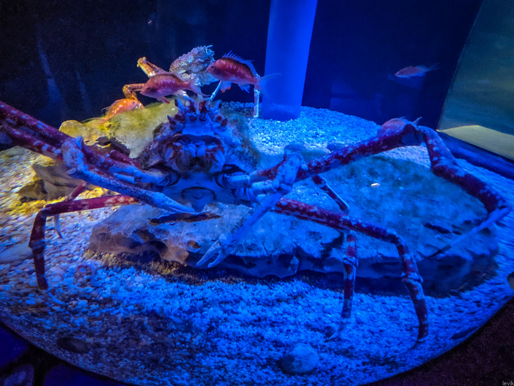 2. В прошлом году аквариум закрывали из-за коронавируса, он не работал месяца четыре, но в июле прошлого года возобновил работу. Сейчас тут всячески пытаются афишировать, что двери открыты. Например, натянули на фасад огромный плакат с осьминогом, а на крыше надули продолжения его щупалец. Выглядит впечатляюще. Правда, внутри я увидел лишь одного осьминога, да и тот спал забившись под камень в самом дальнем углу своего аквариума.