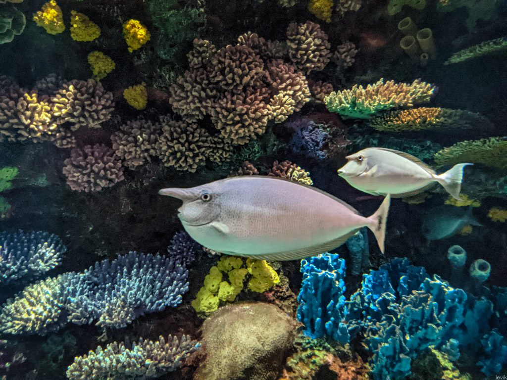 11. А вот отдельный аквариум с яркими тропическими рыбками. Туда же поместили какие-то очень неоновые декорации, и подсвечивают всё это люминесцентными лампами. Одним словом, это специально для Инстаграма.