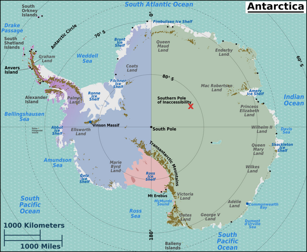 1. В географии есть такое понятие - "Полюс Недоступности". Это точка максимально удалённая от ближайшего края. Полюс недоступности любого континента - место с максимальным расстоянием до самого близкого берега океана. И, разумеется, самый недоступный полюс недоступности находится в Антарктиде. Он отмечен красным крестиком на этой карте, и расположен где-то в 880км от Южного Полюса. А ещё он находится на высоте почти 3,800 метров.