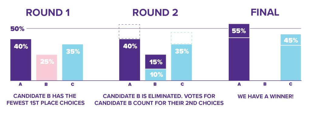Потом все бюллетени распределяют кандидатам, которые отмечены на первом месте. Если кто-то получил больше 50% голосов, он выигрывает. А если никто не добрал до половины, то из голосования выбывает кандидат с наименьшим количеством бюллетеней, а его голоса пере-распределяют тем, кто отмечен следующим по списку. Этот процесс повторяется до тех пор, пока один из кандидатов не получит больше половины оставшихся бюллетеней.