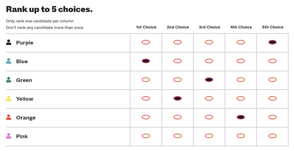Как работает рейтинговое голосование? Вместо одного кандидата избиратель имеет право проголосовать за пятерых, но должен кого-то поставить на первое место, кого-то на второе, и т.д. Если у тебя нет чёткого мнения насчёт пяти кандидатов, то можно отметить меньше - можно даже по-прежнему выбирать только одного.