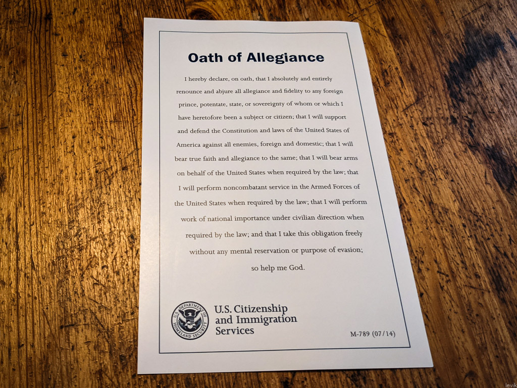 На этих церемониях выдают несколько бумажек, одна из которых - вот такой листик, с текстом присяги, который новые граждане должны зачитывать. Из всего текста присяги обычно самый живой интерес у людей вызывают именно эти слова в заголовке поста.