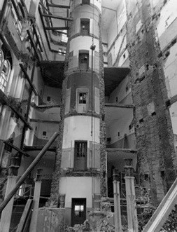 Будучи инженером, Купер посчитал, что оптимальная форма для лифта, а значит и для его шахты - круг. И действительно, куперская шахта представляет собой эдакую трубу, вертикально втиснутую в здание ВУЗа. На фотографии справа видно, как эта шахта выглядела во время капитальной реставрации Купер Юниона, когда меняли всё кроме внешних стен и самого лифта.