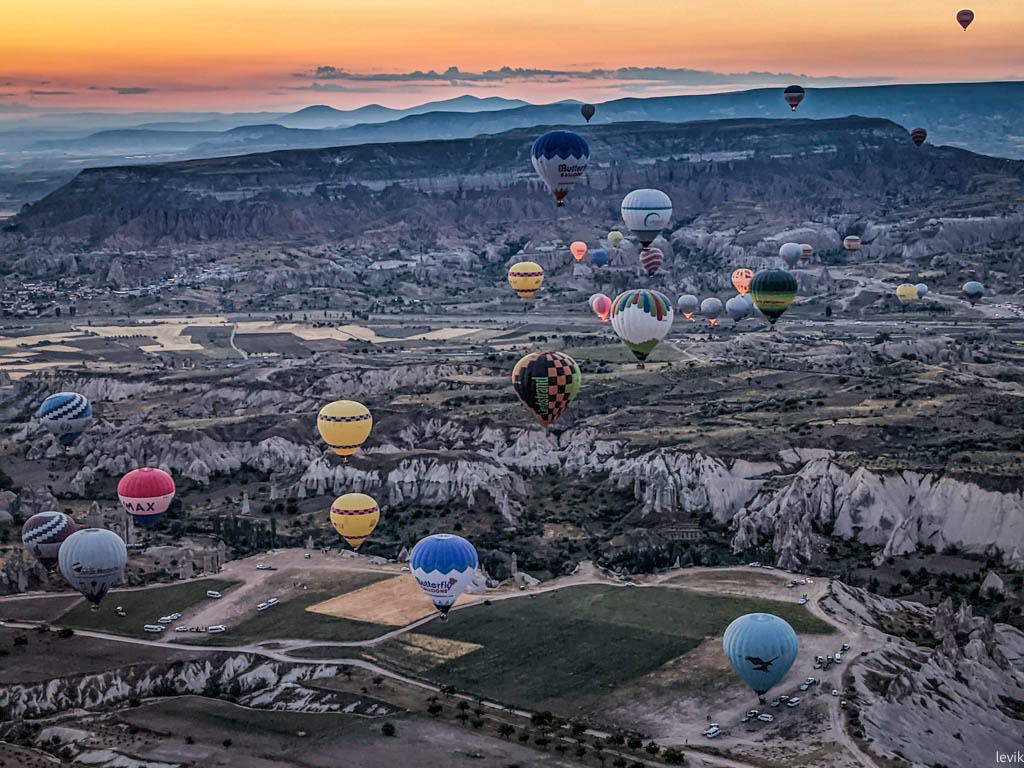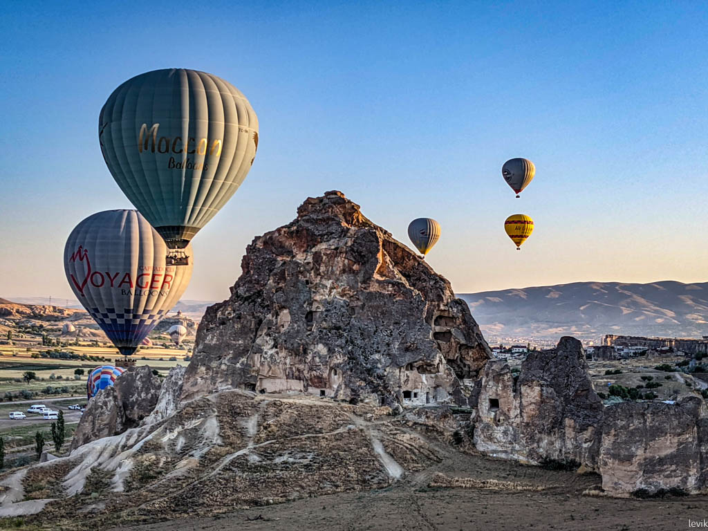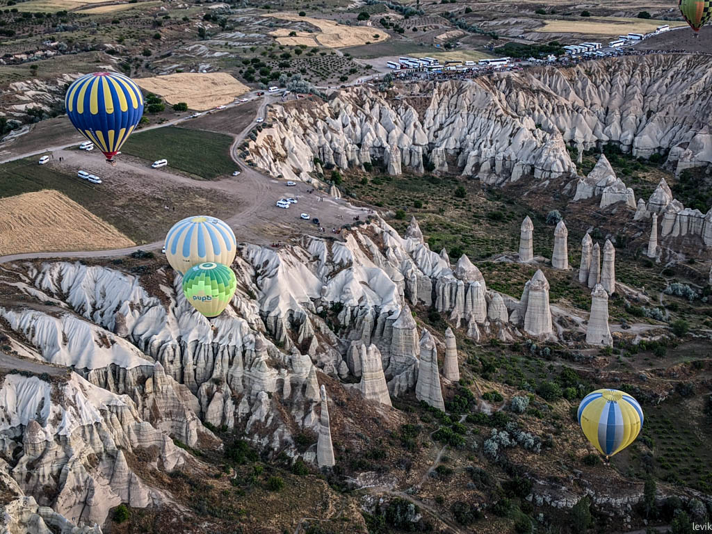 Но, по разным причинам, Каппадокия является в наши дни главной точкой воздухоплавания, а значит что даже в медленный сезон после худших уровней ковида, здесь каждое утро взлетают несколько дюжин шаров. Разумеется, до пандемии их было больше: маленькие, пёстрые, одноцветные... Все небо было полно шарами, каждый из которых периодически загорался в предрассветных сумерках, когда пилот давал газу.