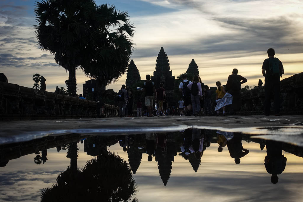 2. Так как это самая популярная точка для съёмки самой популярной достопримечательности, всем известно, что к рассвету фотографировать храм собираются полчища народу. Причём все норовят занять место у кромки воды на дальней стороне лужи от храма. Чтобы очутиться в первых рядах всем рекомендуют приезжать за полчаса, а то и за час до рассвета. В итоге туристы приезжают всё раньше и раньше, и всей толпой ждут пока не появится солнце. В своём рассветном отчёте Варламов неплохо описал, как это всё происходит.