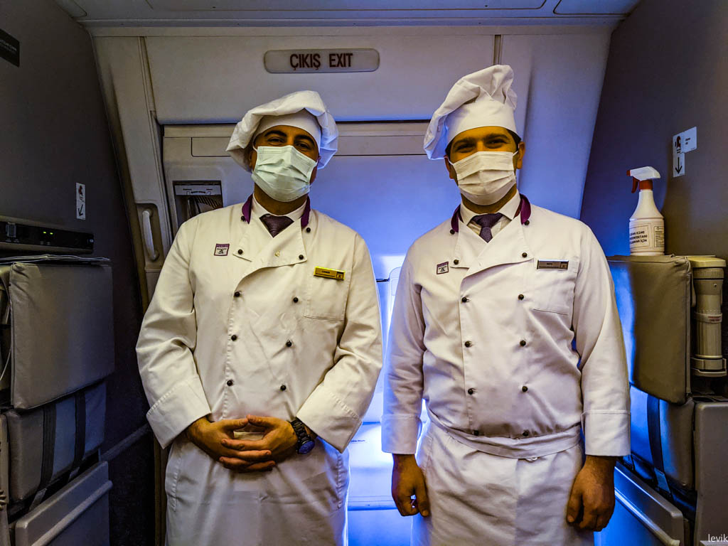 5. Но на этот раз всё изменилось. Уже на входе в самолёт нас приветствовали двое мужчин в белой форме и великолепных поварёных шапочках. Что бы там не говорили про эпидемиологическую ситуацию в Турции, ковид явно отступил, и авиа-повара вернулись!