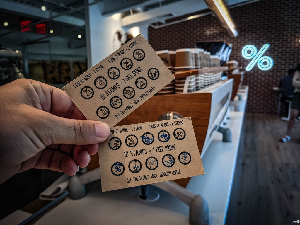 Я выпил там кофе, написал об этом пост, но знал, что обязан вернуться - ведь у меня дома лежали две карточки лояльности, заполненные посещением различных точек Арабики в восьми отдельных странах и территориях. Знаете, эту фишку, когда вам при покупке кофе ставят печать, а после того как их набралось десять штук, можно получить один напиток бесплатно?