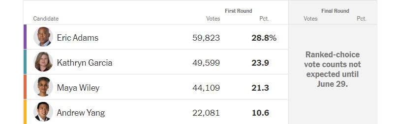 Кстати, следует упомянуть, что и у республиканцев сегодня тоже были праймериз. Но у них на мэра выдвигается всего два кандидата, так что рейтинговое голосование тут ничего не меняет. Кто бы из них не одержал победу сегодня, ему вряд ли что-либо светит на общих выборах в ноябре.