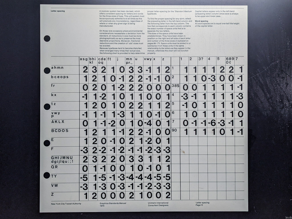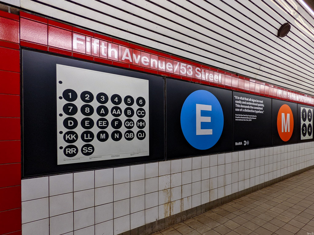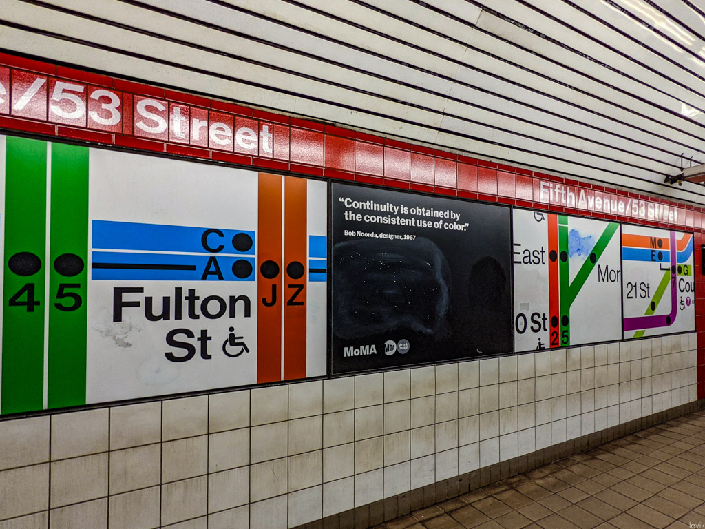 Это была выборка дизайн-кода нью-йоркского метро, разработанного в 1970 году компанией Unimark. Результат кропотливой работы полувековой давности, этот руководство создало единый графический стиль для всех надписей на станциях самого крупного метро в мире. И тут, прямо на одной из платформ, в виде реклама музея MoMA были выставлены напоказ самые ключевые из этих решений.
