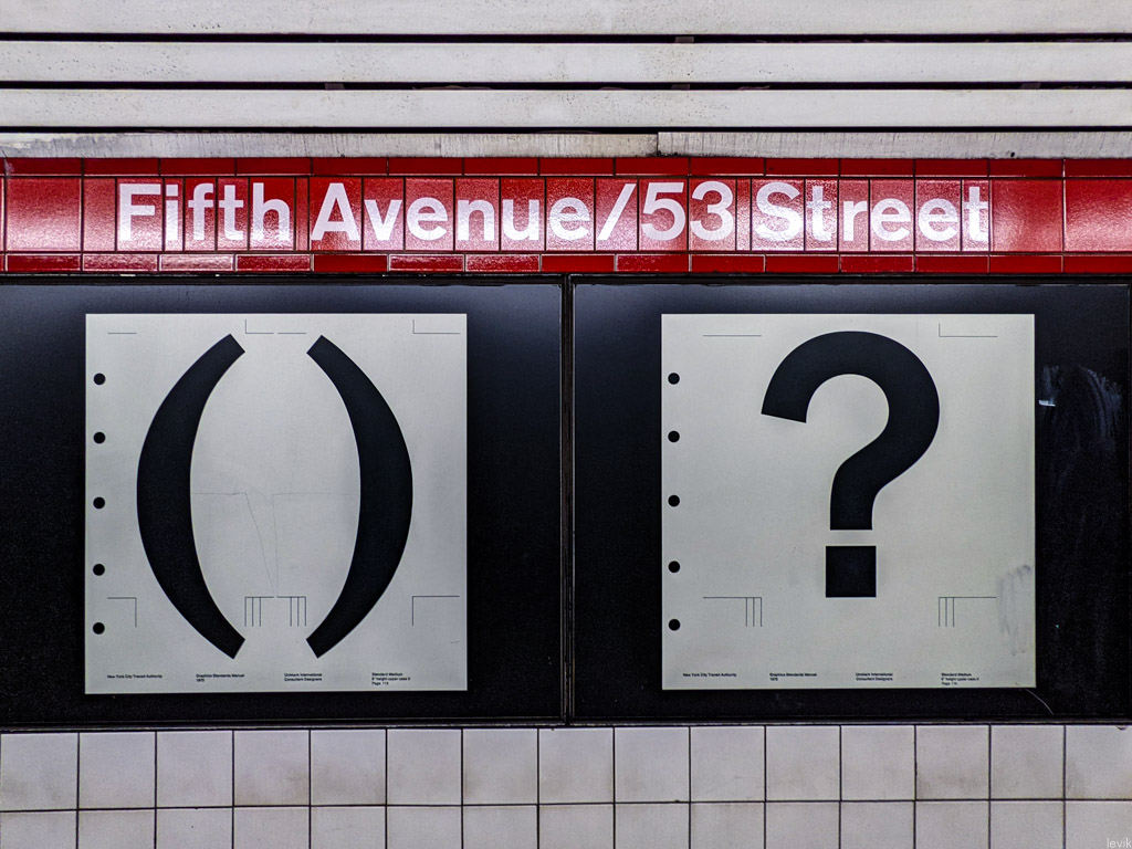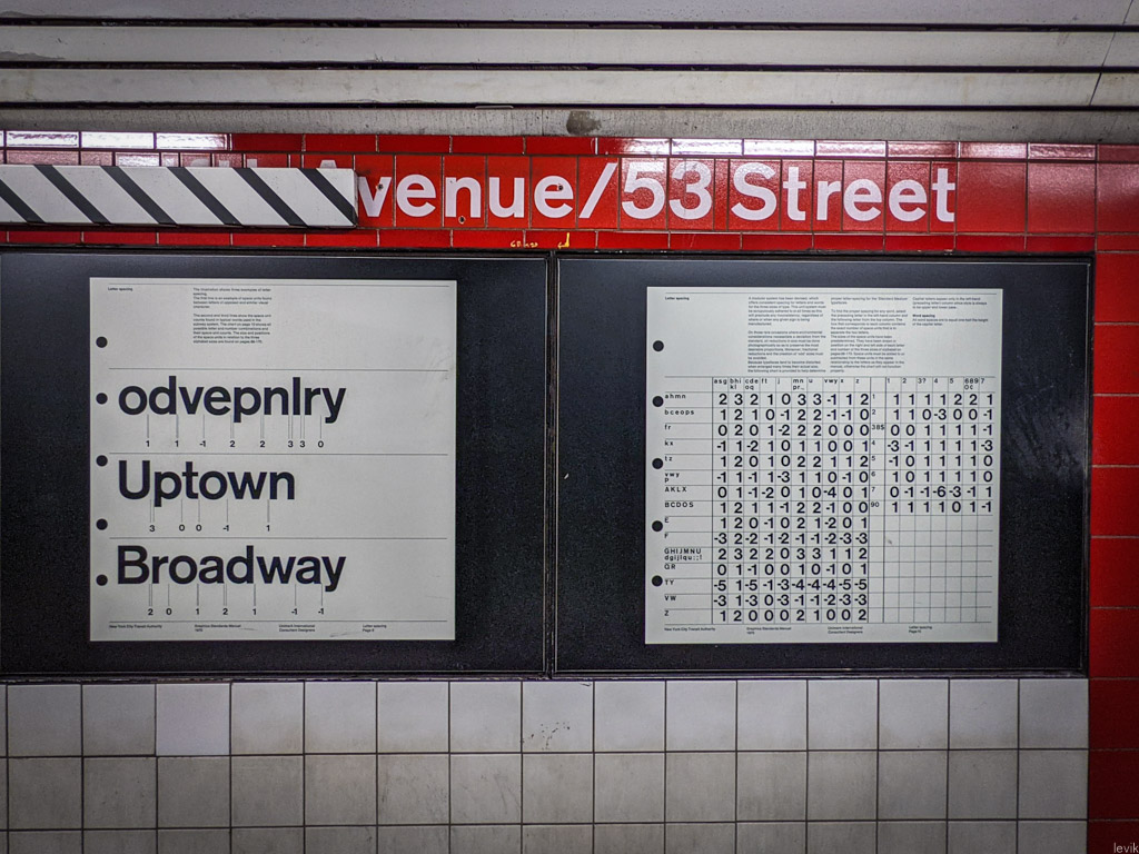 1. Сегодня печатный стиль табличек нью-йоркского метро легко узнать по нескольким буквам, начерченных белым по чёрному. Даже в самых далёких от метро контекстах его сложно не узнать! Однако так было не всегда.