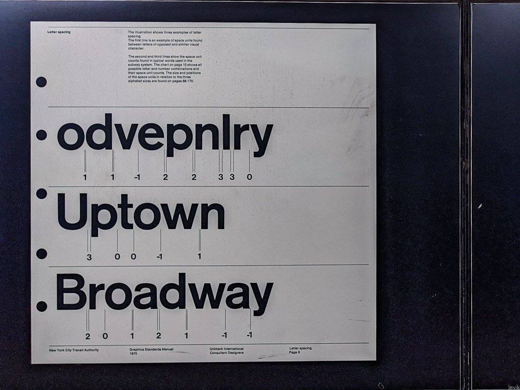 Дизайнеры Unimark были специалистами своего дела. Они долго выбирали шрифт, который легко бы считывался издалека и в движении - будь то из окна движущегося вагона ("Это что за остановка?"), или на ходу ("Мне сейчас влево или направо?").