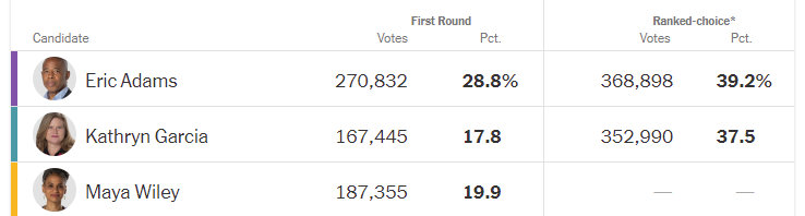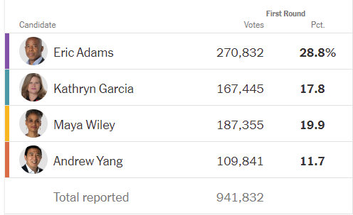 Но всё не так просто - ведь в Нью Йорке в этом году впервые действует "рейтинговое голосование", позволяющее каждому избирателю выбрать до пяти кандидатов в порядке предпочтения. И если раньше нам раскрывались только подсчёты того, кто получил первое место, то сегодня стали известны предварительные результаты голосования с учётом всех выбранных кандидатов. И Адамс вдруг потерял свой внушительный отрыв. Короче, картина стала гораздо более непонятной, а окончательного победителя мы пока не знаем, так как подсчитали ещё не все голоса!