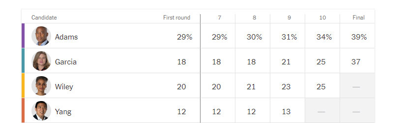 В девятом раунде выбыл один из фаворитов гонки, Эндрю Ян, который к концу гонки немного сдулся. На тот момент у него накопилось всего 13 процентов голосов. И тут сыграл важную роль союз, который Ян заключил с Кэтрин Гарсией в последние дни перед выборами. Кандидаты вели кампанию совместно, призывая своих сторонников ставить другого на второе место.