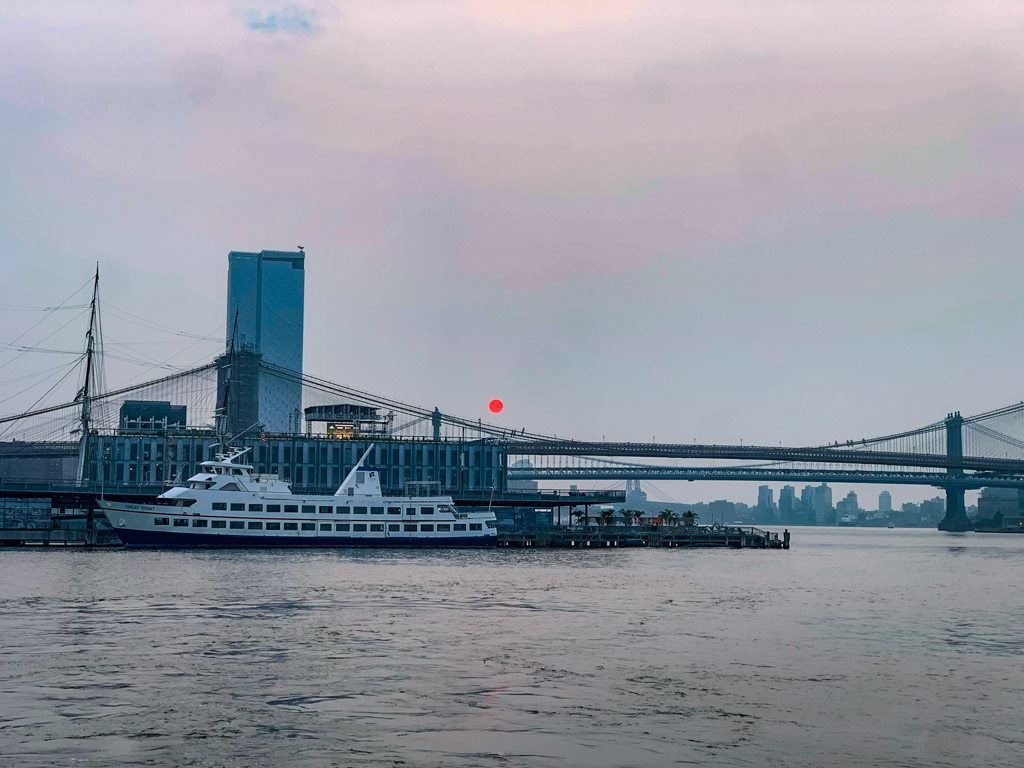 Моя подруга Женя уже несколько лет ведёт здоровый образ жизни. Встаёт в какую-то невероятную рань, хватает велосипед и мчит ни свет ни заря в разные живописные точки Нью Йорка. К моменту, что я продираю глаза, с Жени уже семь потов сошло в ходе тренировки. И вот, сегодня, когда я, медленно просыпаясь, листал ленту Фейсбука, увидел, что она выложила фотографии хмурого утреннего города, с каким-то странным ядовито-красным диском в небе.