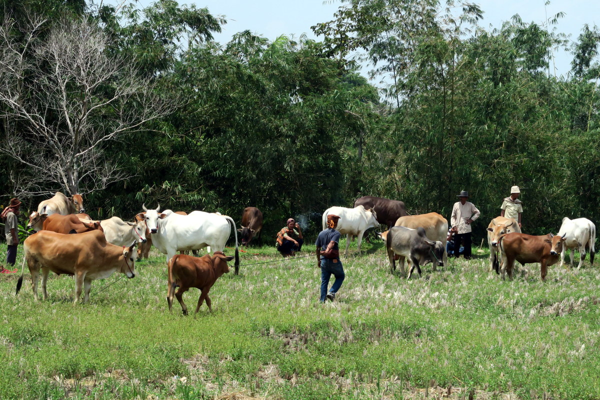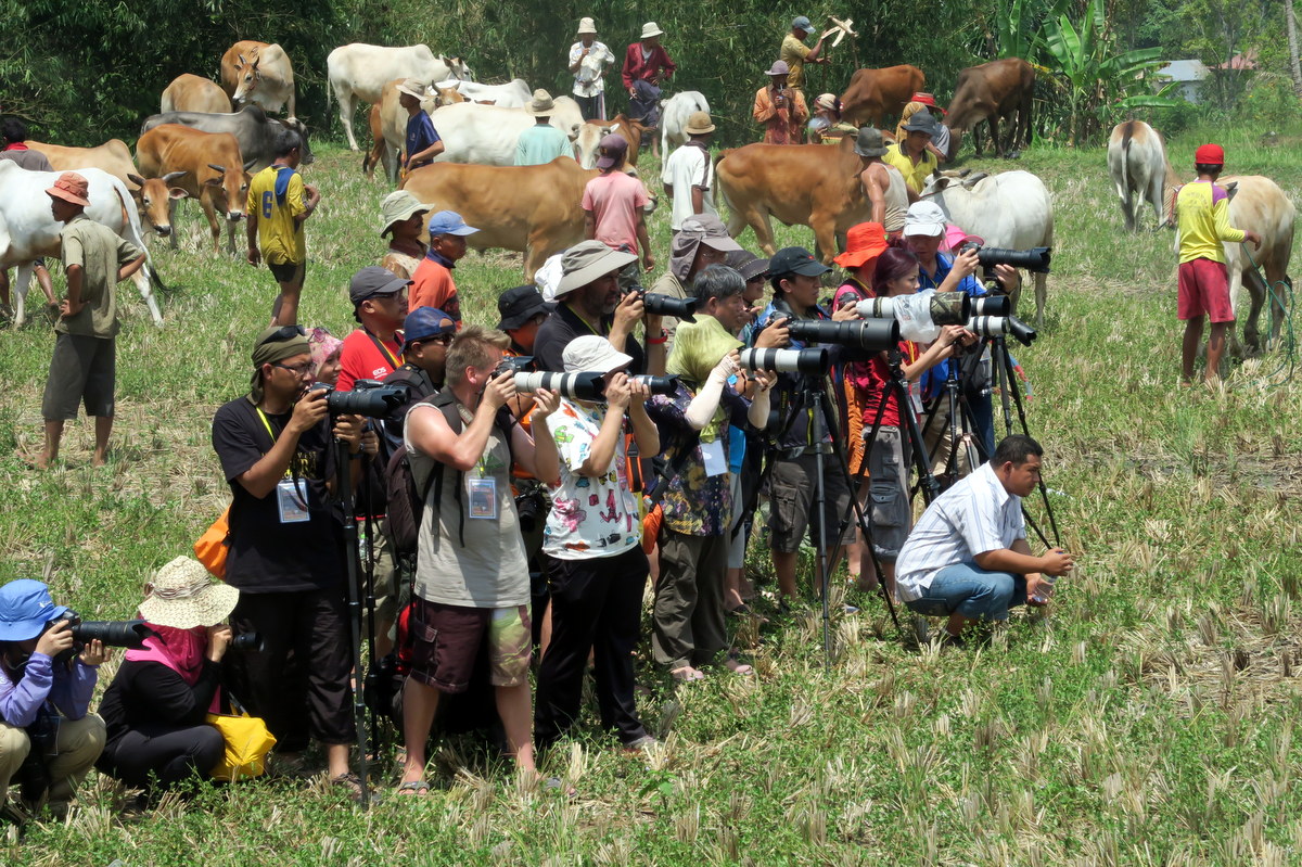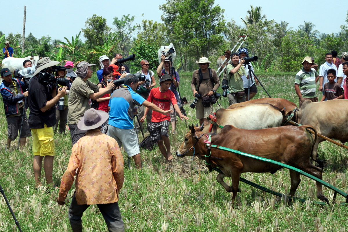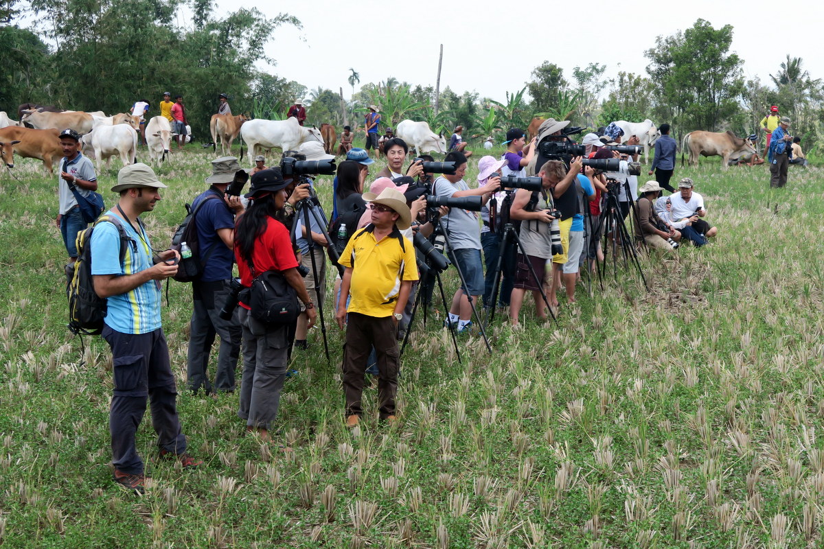 Быки с разгона выбегают из мокрой части поля, чем изрядно пугают линейку иностранцев-фотографов. На удивление, животные моментально тормозят, и позволяют выбежевшему откуда-то мальчишке увести себя в сторонку. Вскоре туристы привыкнут к тому, что быки никакого вреда им не причинят, и перестанут шугаться.