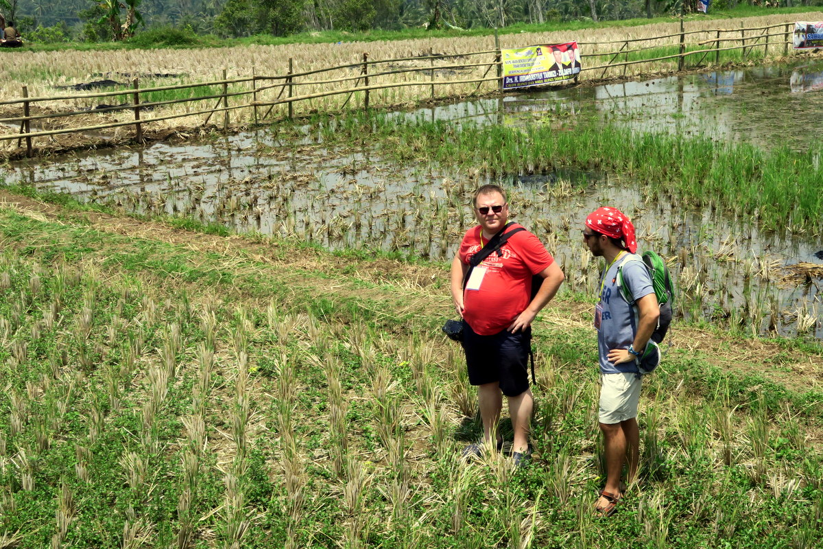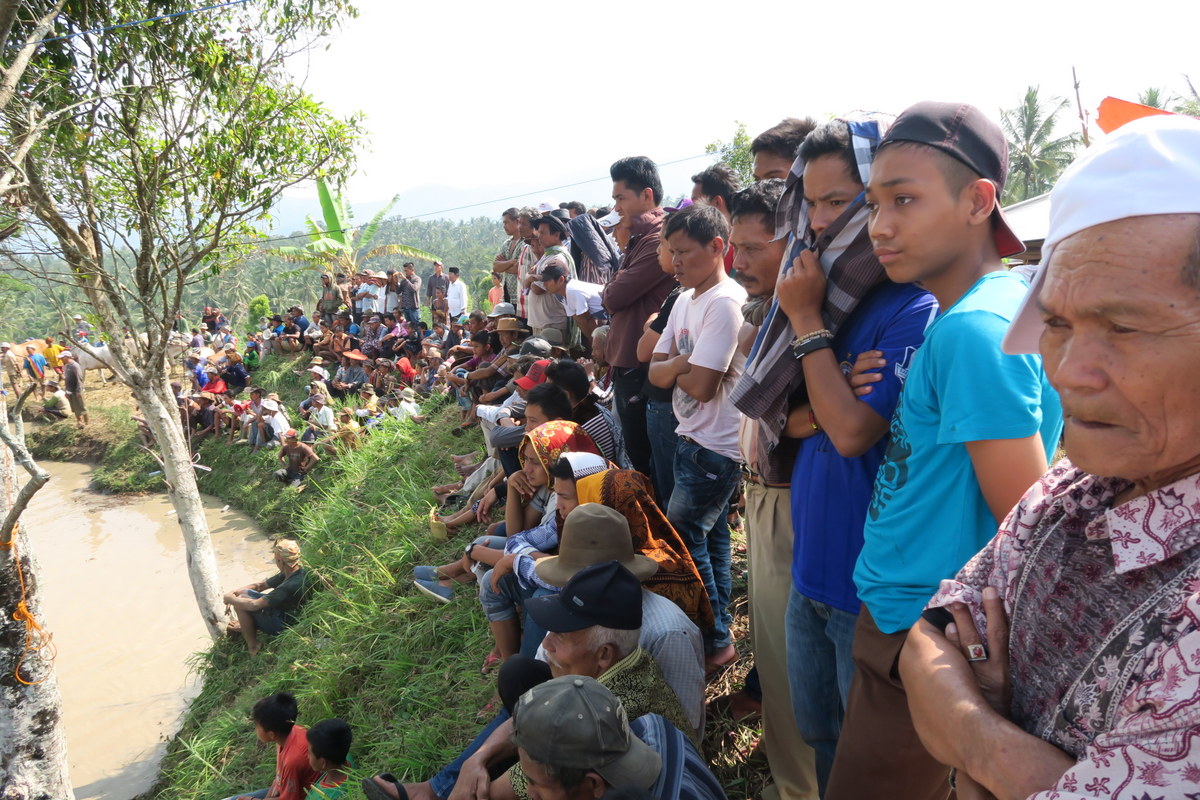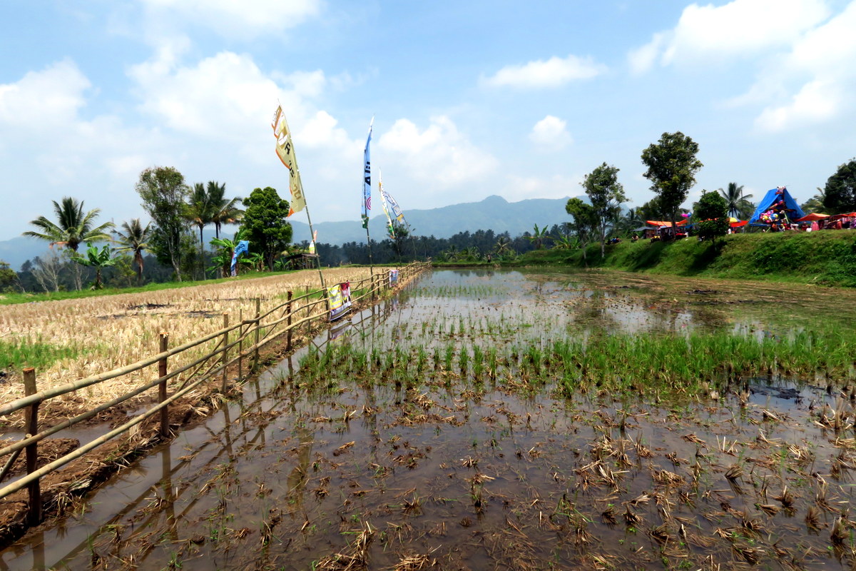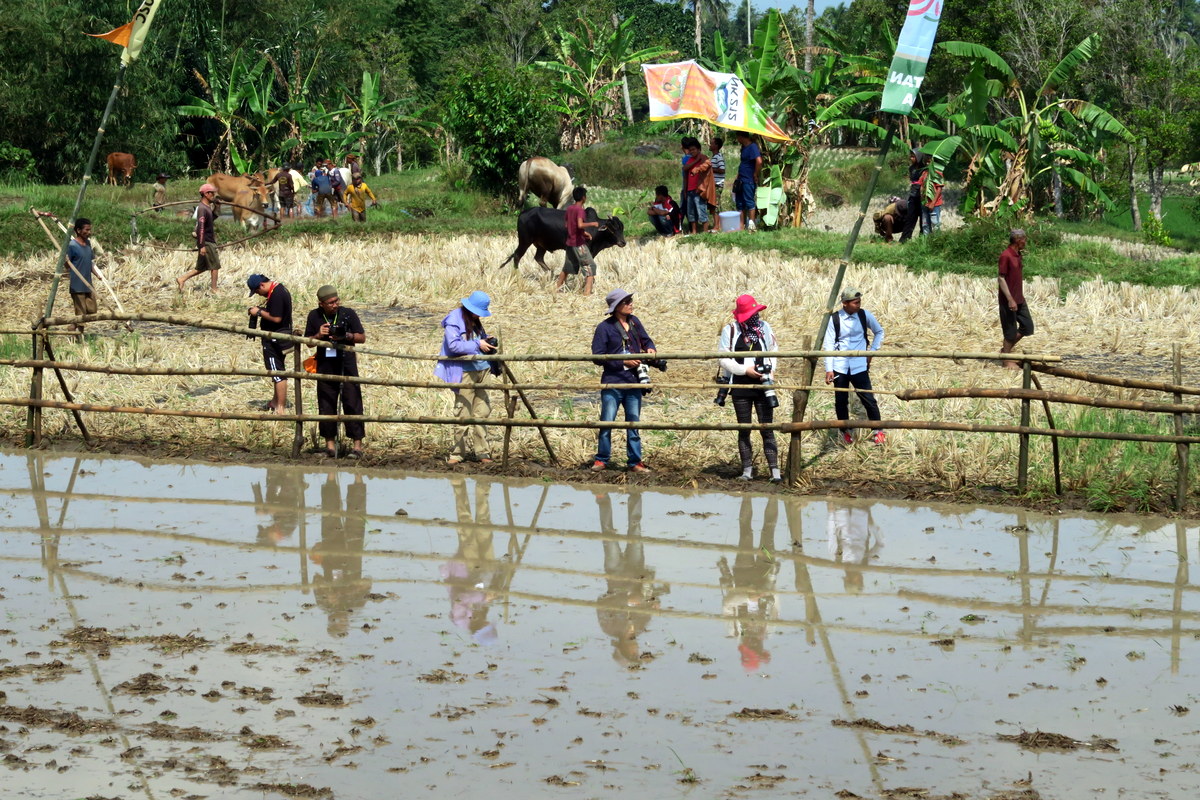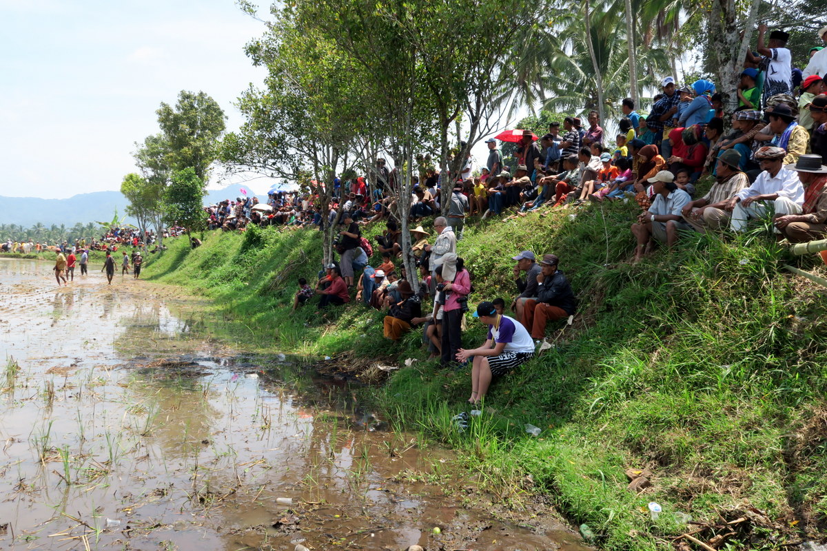 Фестиваль проходит на рисовом поле, несколько десятков метров в длину. Ещё недавно здесь росли рисовые колосья, но сейчас оно очищено. Его разделили пополам заборчиком, и одна из половин залита водой - именно по ней будут бежать быки.