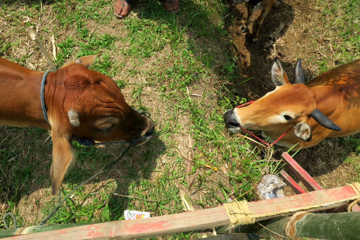Те, у кого быков не было несли на фестиваль деревянные конструкции, формой напоминающие лодочки. Эти штуки во время гонок одеваются на быков вместо сбруи - вилка на "корме" лодочки цепляется сверху шеи, всё остальное волочится сзади. Маленькая перекладина на "носу" служит подставкой для ноги жокея.