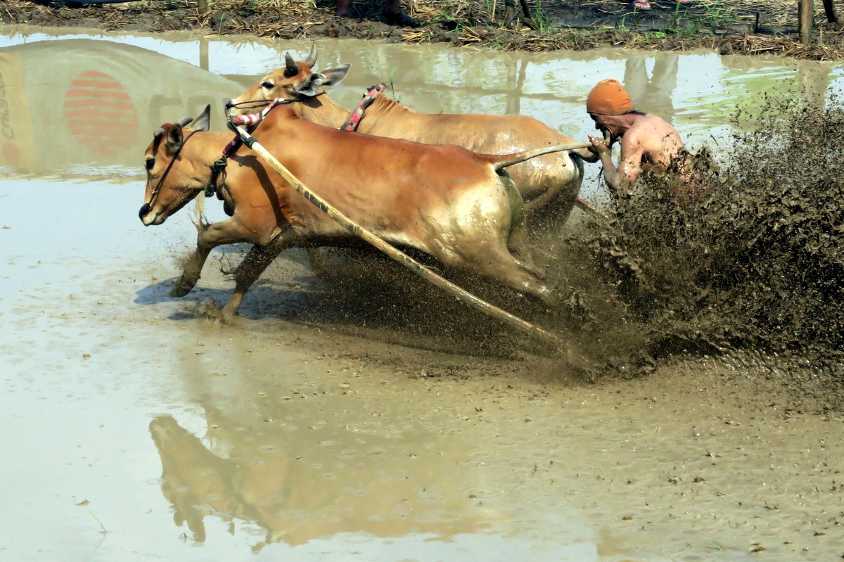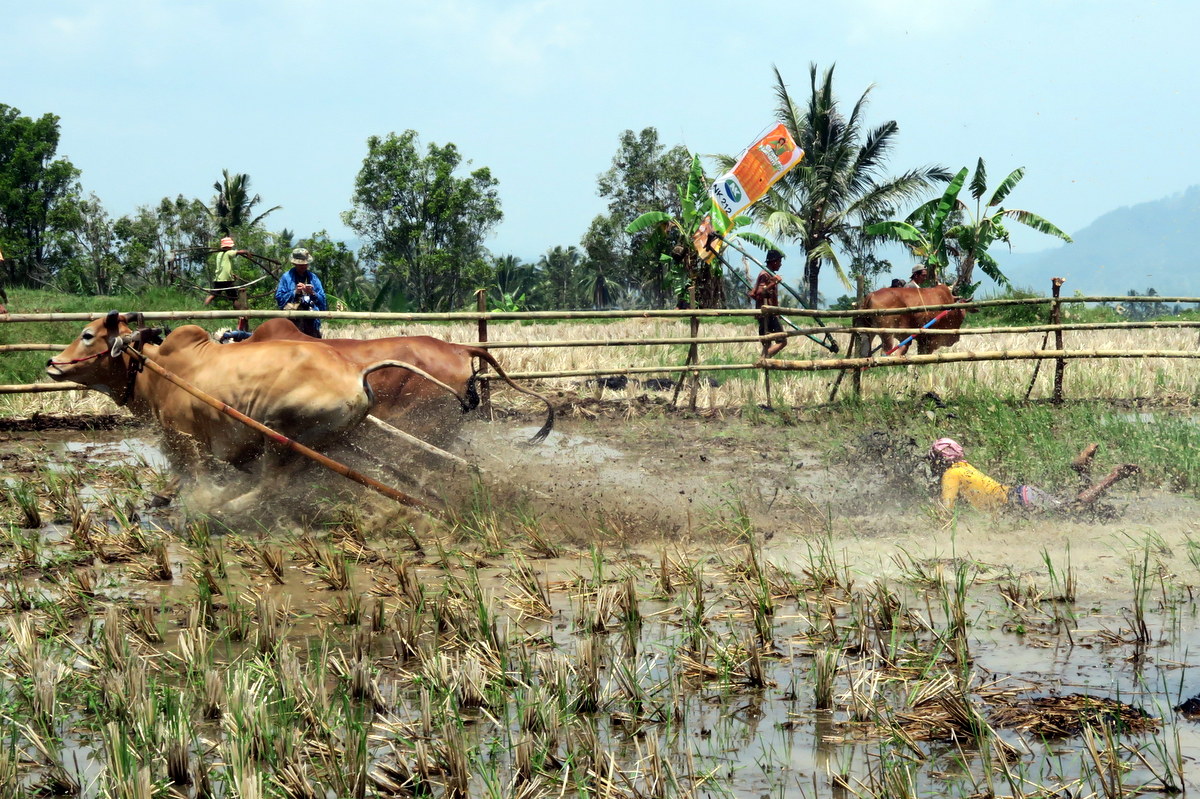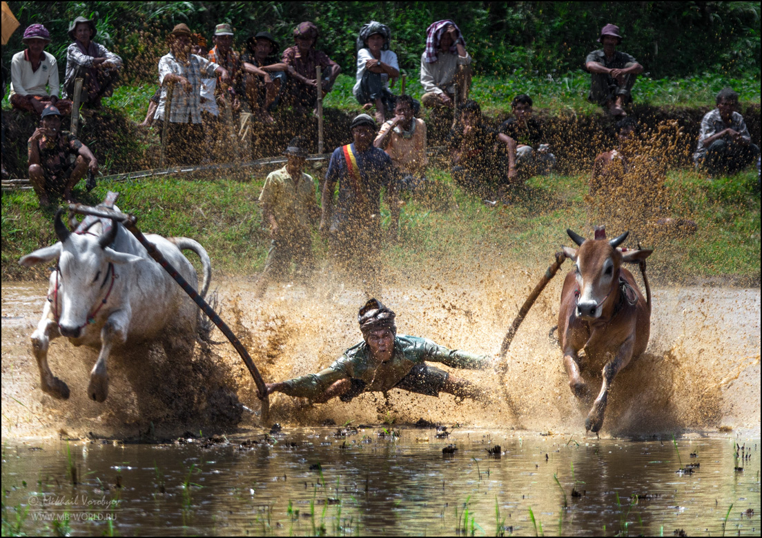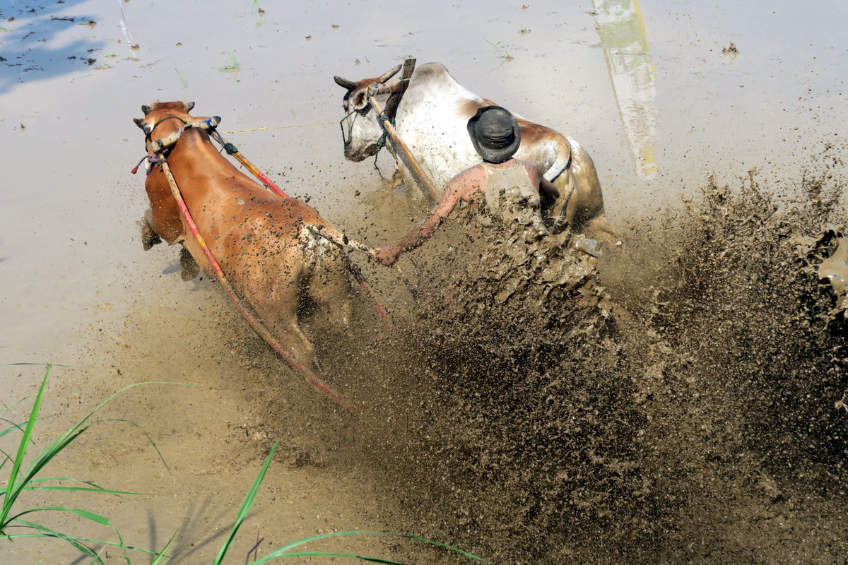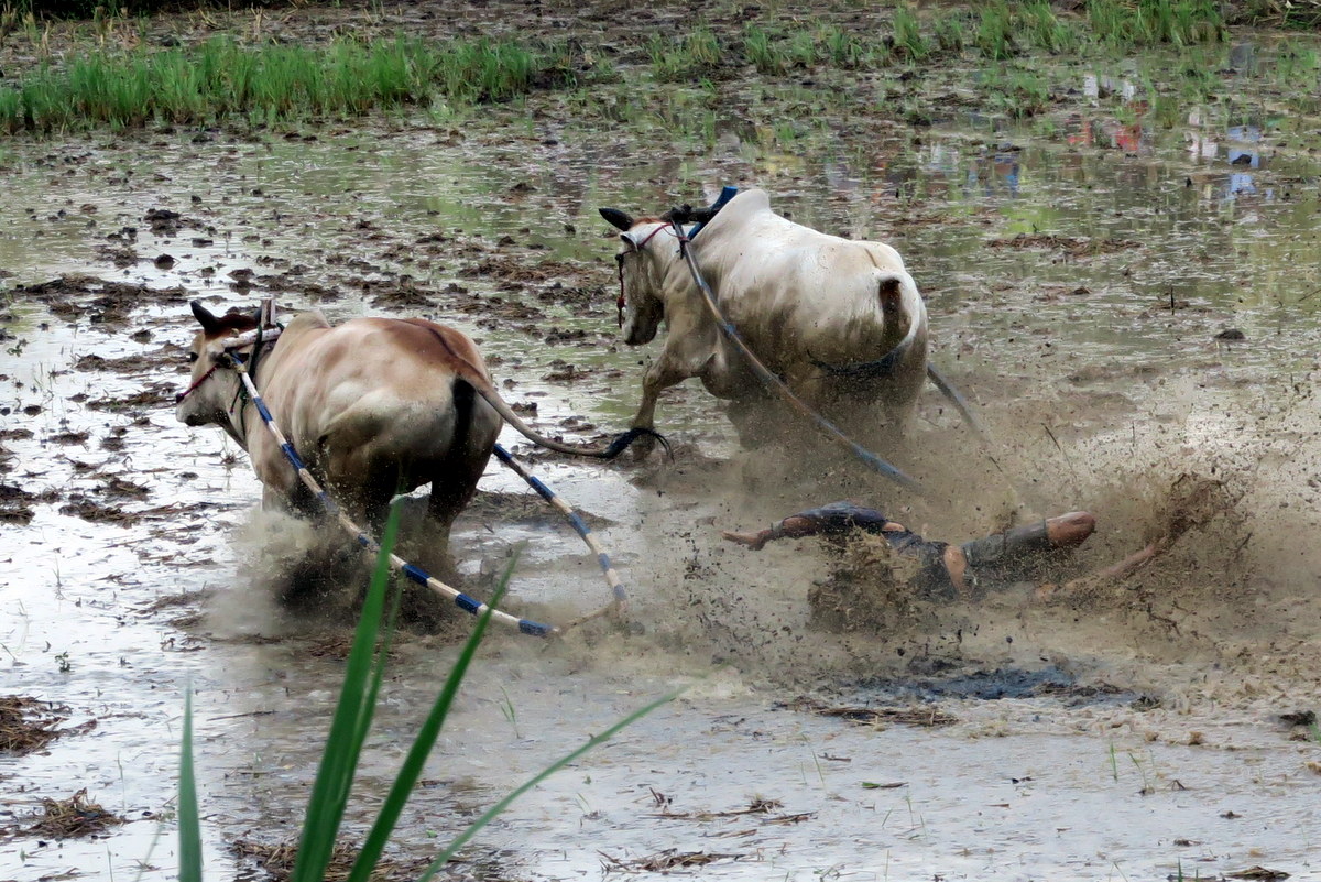 Держаться вот так вот за хвост бегущих быков, стоя на дощечках, вспахивающих дно рисового поля весьма нелегко. Даже опытным наездникам зачастую не удаётся доехать стоя до конца, и они падают в грязь.