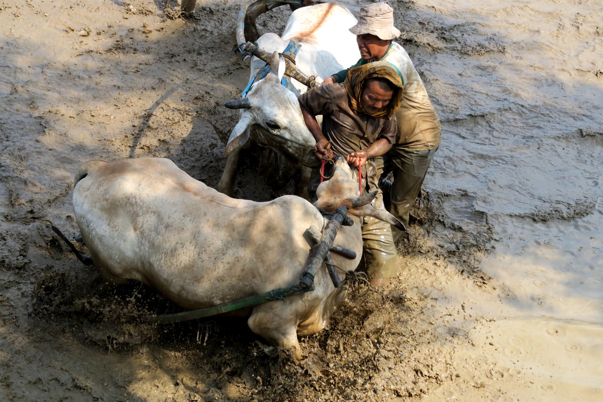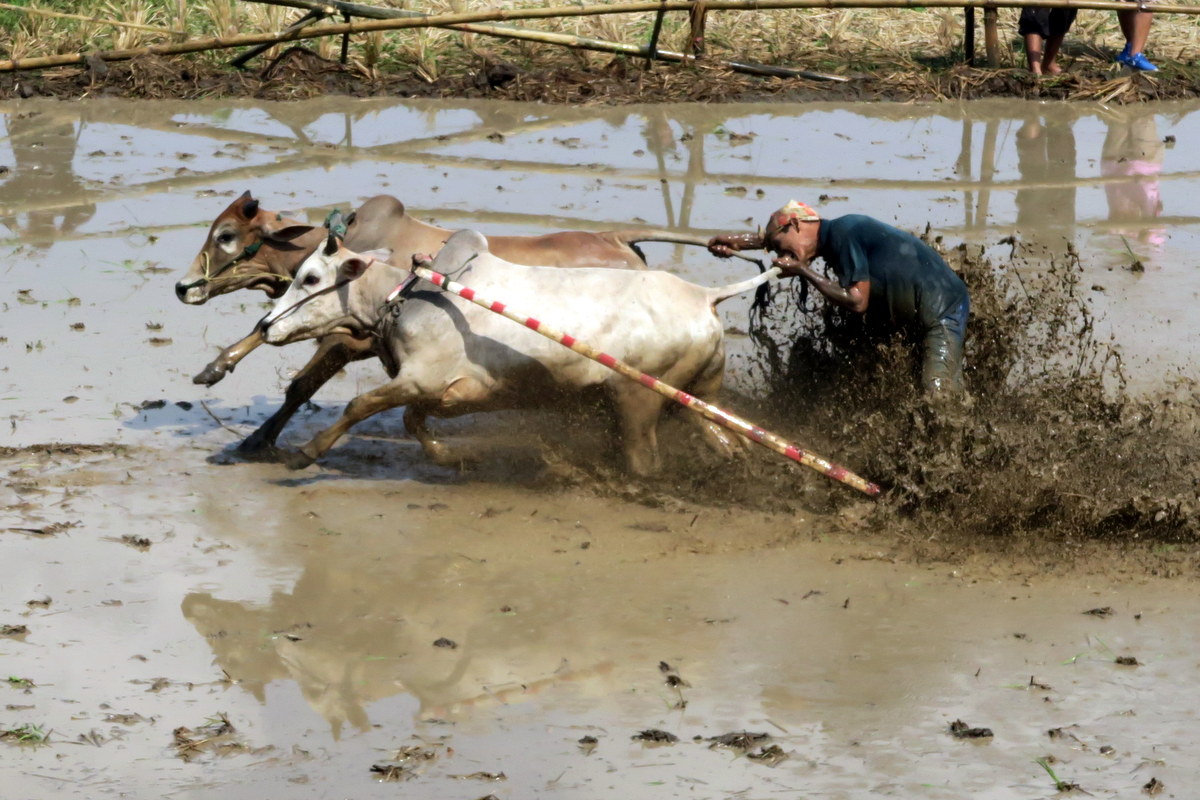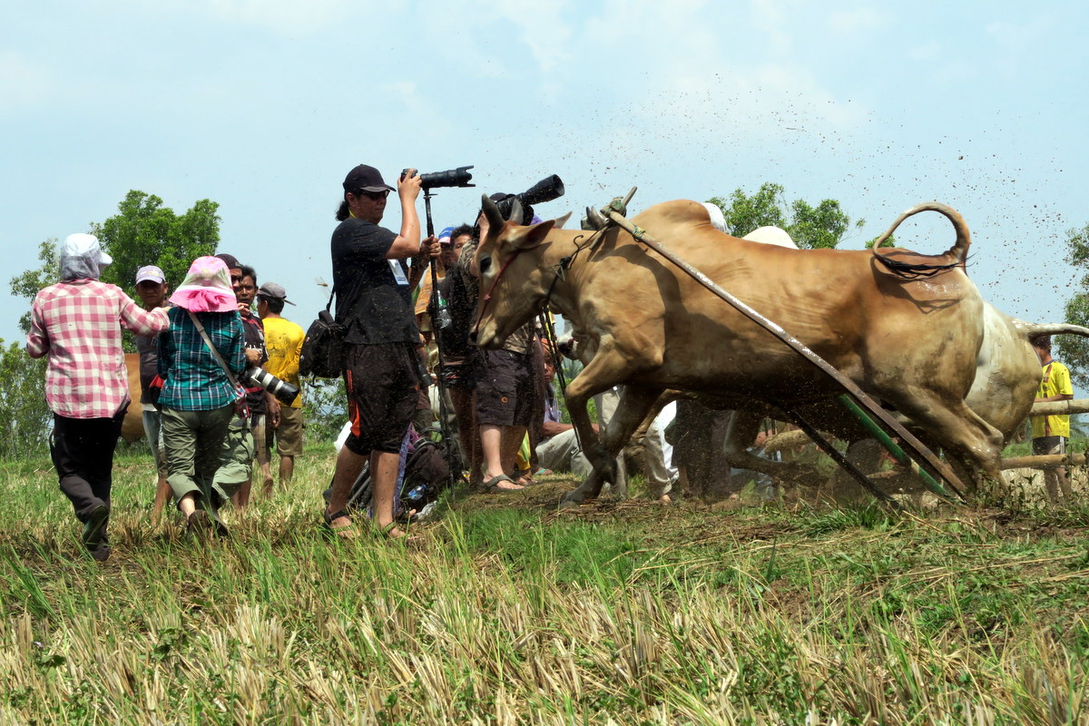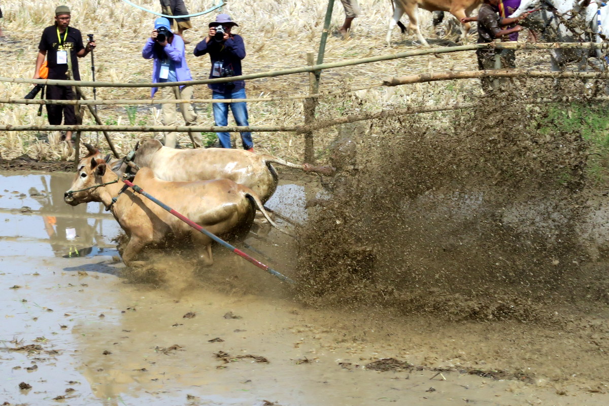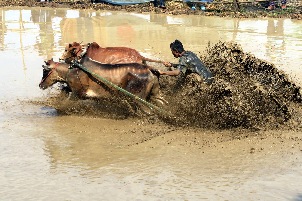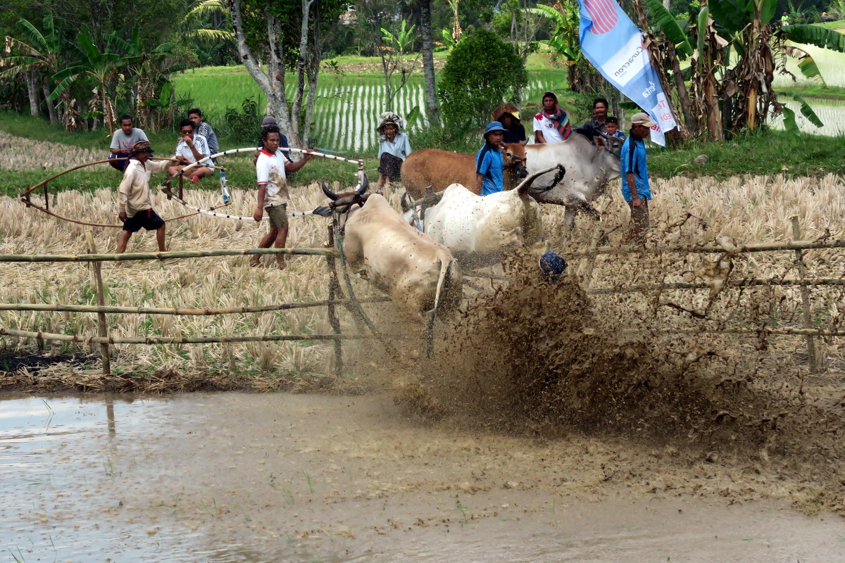 Держаться вот так вот за хвост бегущих быков, стоя на дощечках, вспахивающих дно рисового поля весьма нелегко. Даже опытным наездникам зачастую не удаётся доехать стоя до конца, и они падают в грязь.