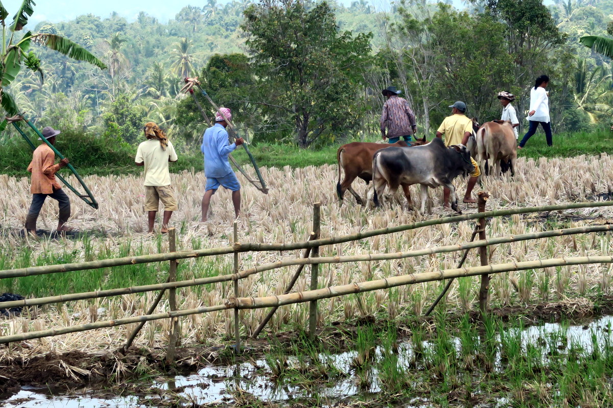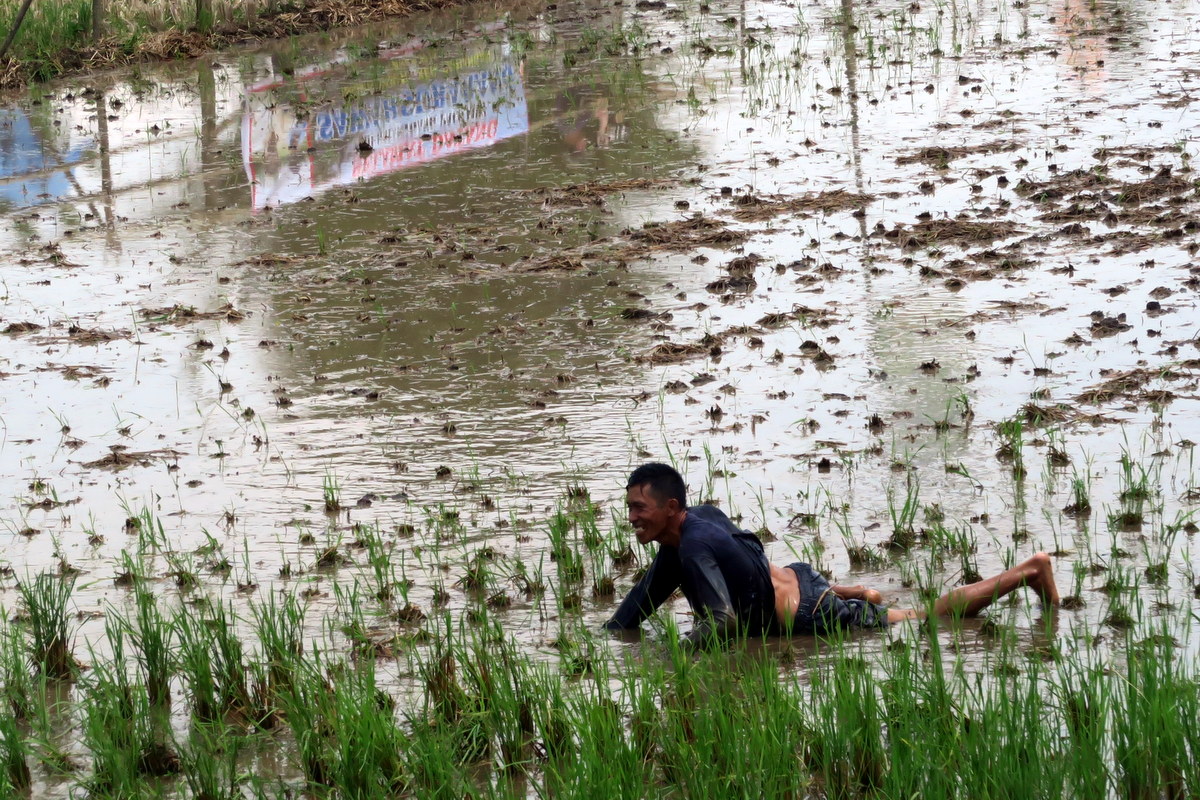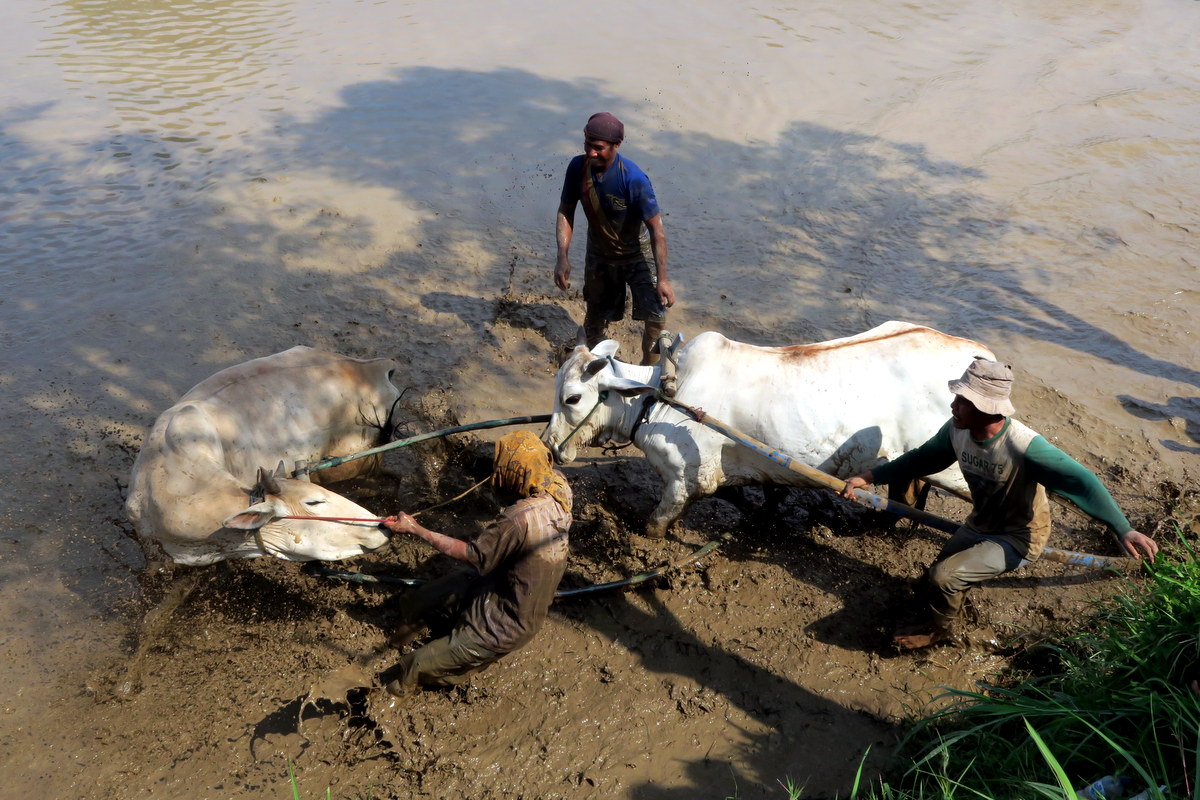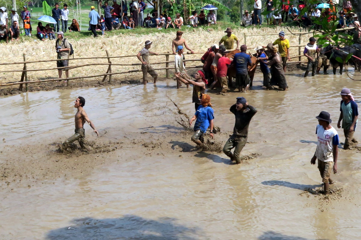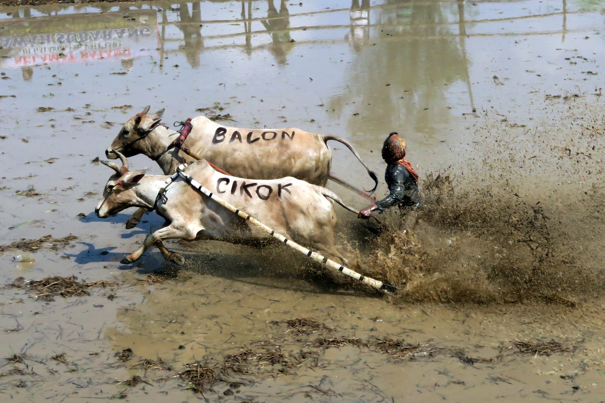Держаться вот так вот за хвост бегущих быков, стоя на дощечках, вспахивающих дно рисового поля весьма нелегко. Даже опытным наездникам зачастую не удаётся доехать стоя до конца, и они падают в грязь.