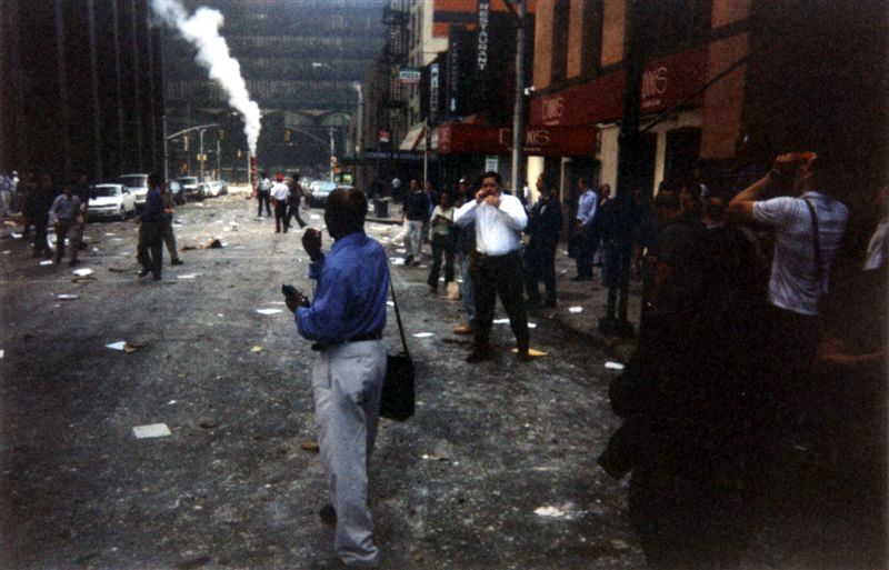 Мой друг Сашка тоже работал в даунтауне, и в тот день как обычно приехал утром на работу. Но, увидев пылающие башни, купил в ближайшем магазинчике одноразовый фотоаппарат, и пошёл фотографировать происходящее.