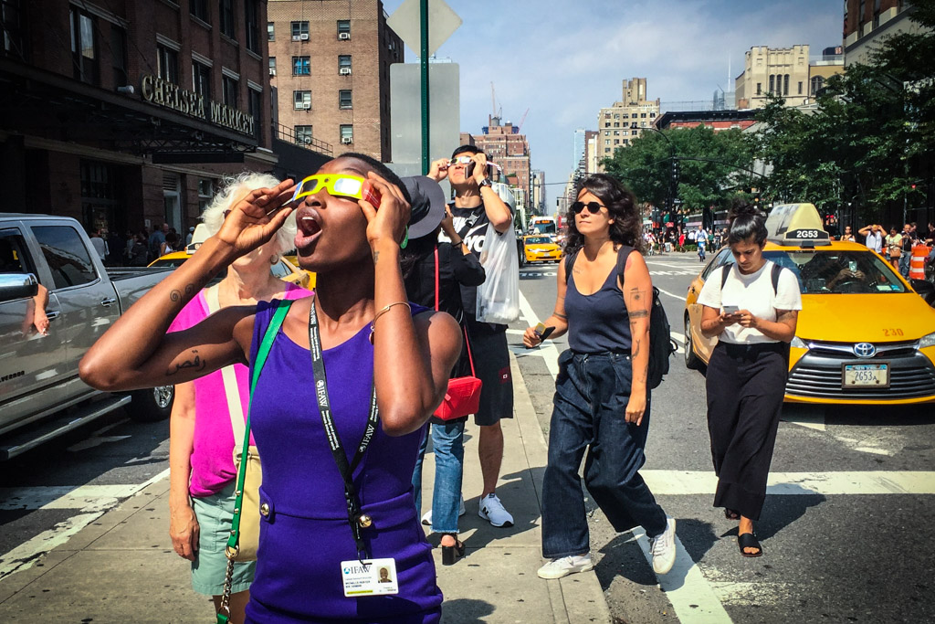 Сегодня в небе над США можно было наблюдать солнечное затмение. Жителям узкой полосы, проходящей через всю страну повезло - они видели, как луна полностью закрыла солнечный диск. Нам в Нью Йорке удача улыбнулась чуть меньше - мы видели лишь 70-процентное затмение, но это тоже было довольно круто.