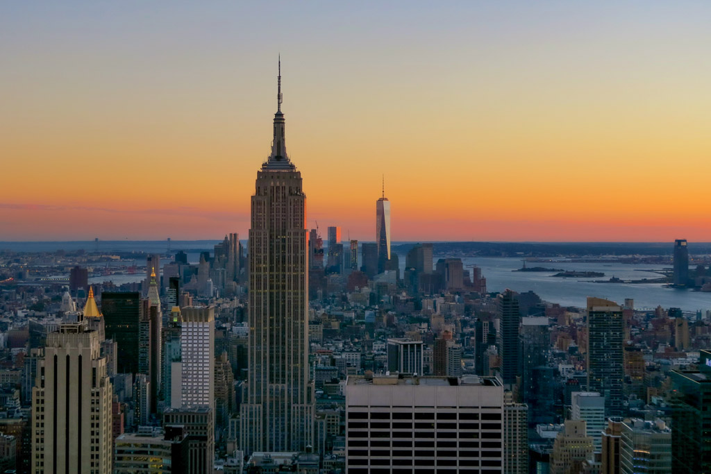 Иногда гости Нью Йорка меня спрашивают: Лёва, на какую из смотровых площадок вашего города лучше подниматься? На Эмпайр Стейт или на Всемирный Торговый Центр? Обычно я отвечаю, что лучше всего - ни на ту, ни на другую. Самой хорошей площадкой я считаю Рокфеллер-Центр, потому что это мало примечательное снаружи здание, и вам не жалко будет, поднявшись на смотровую его не увидеть. Зато вы увидите те два других знаменитых нью-йоркских небоскрёба.