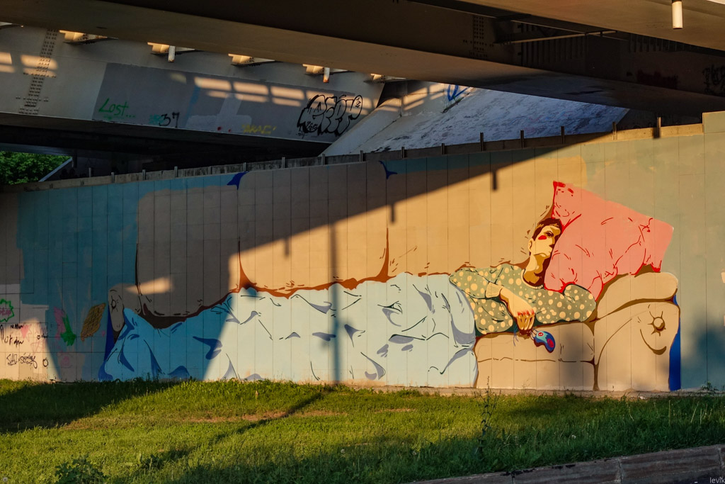 В Казани мне повезло с местными жителями. Весёлые, открытые люди встретили меня чуть ли не с самолёта, и показывали свой город до момента, когда я сел в поезд назад в Москву. Одна из интересных штук, которых я бы не увидел без их помощи - это собрание стрит-арта под эстакадой, ведущей на мост Миллениум.
